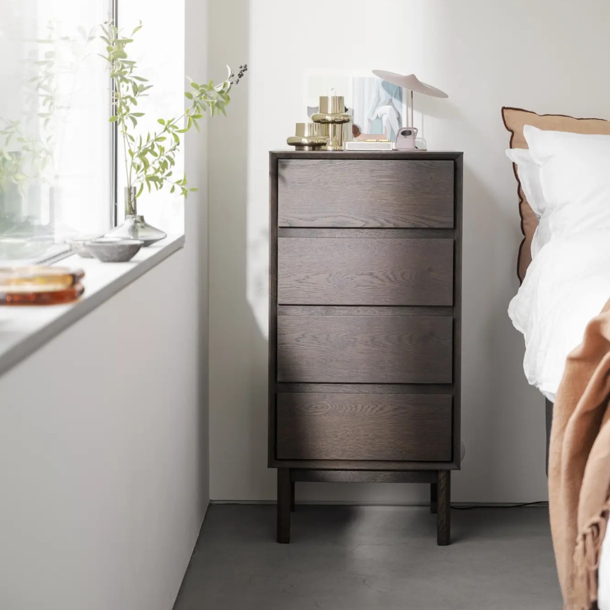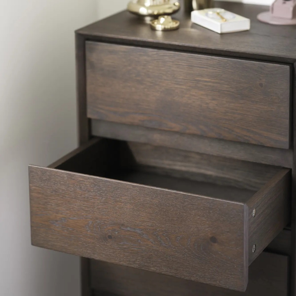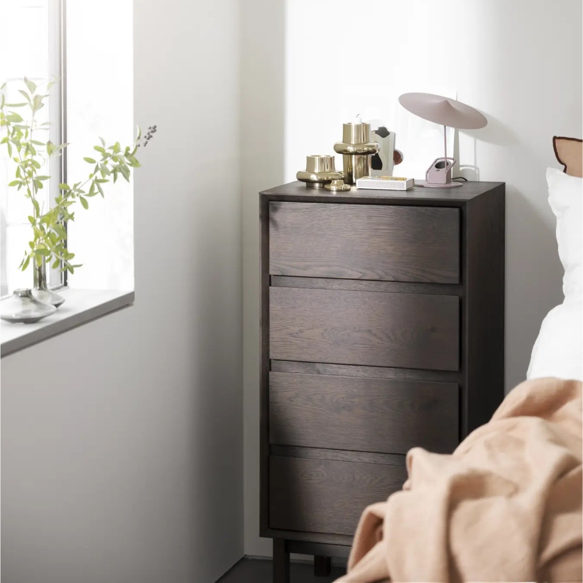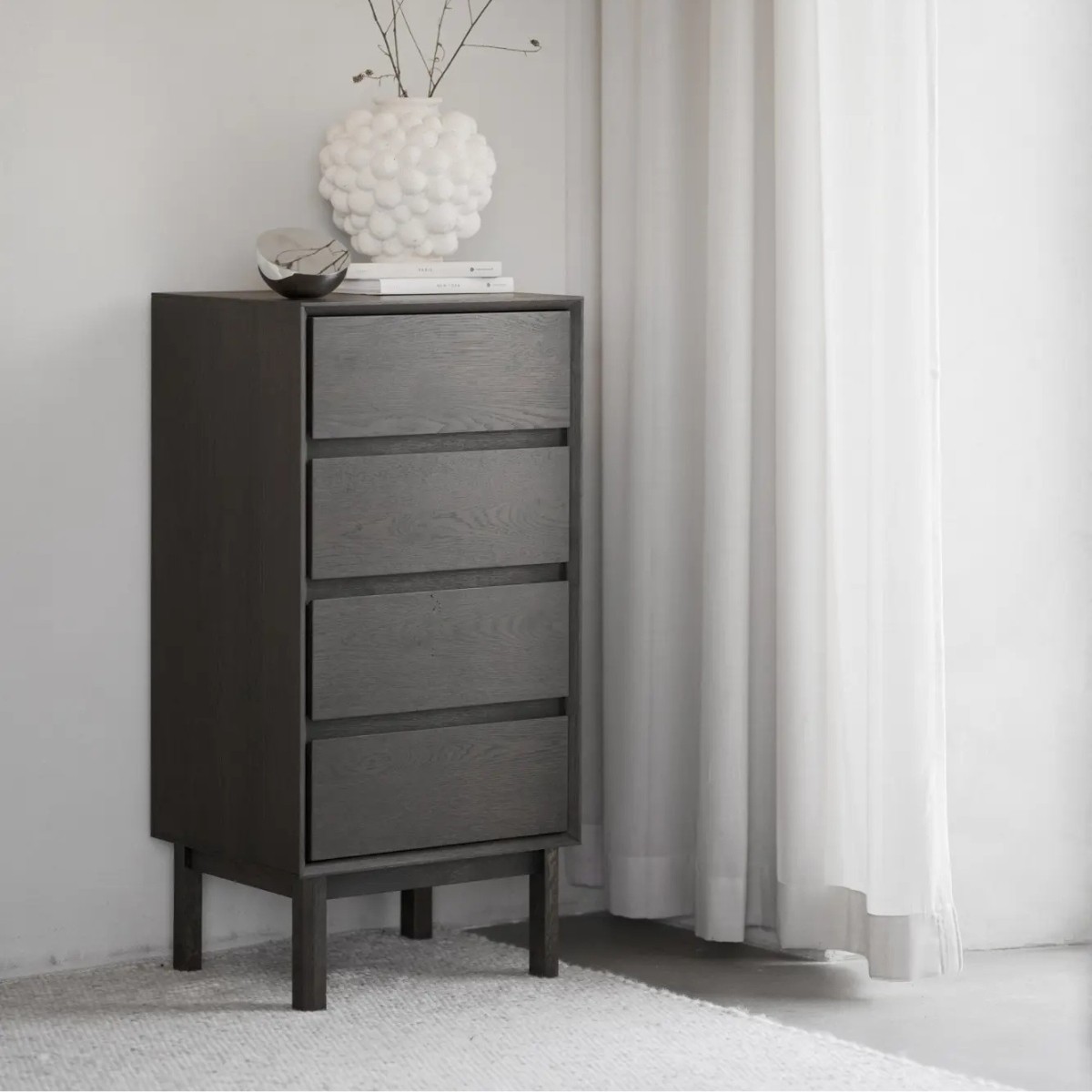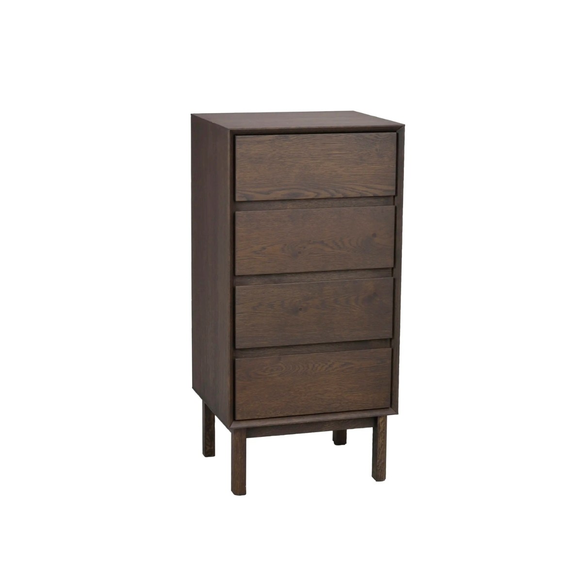 Cómoda alta Mackay de Rowico en roble salvaje, con acabado marrón o natural aceitado. Diseño clásico, con cuatro cajones y esquinas en inglete.