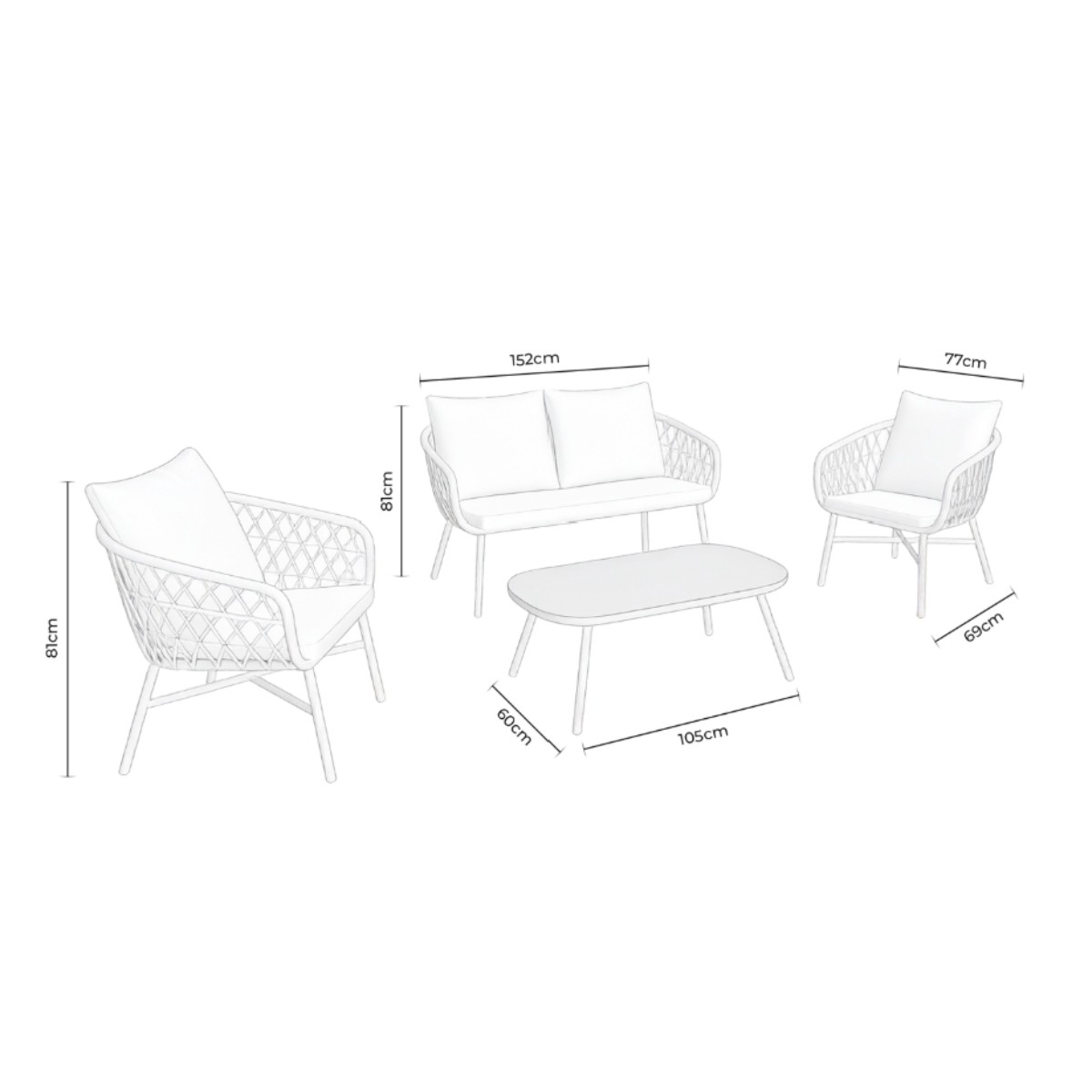Está compuesto por dos sillones individuales, un sofá de dos plazas y una mesa de centro con superficie de cristal templado de 5 mm, ideal para disfrutar de momentos de descanso o reuniones al aire libre.