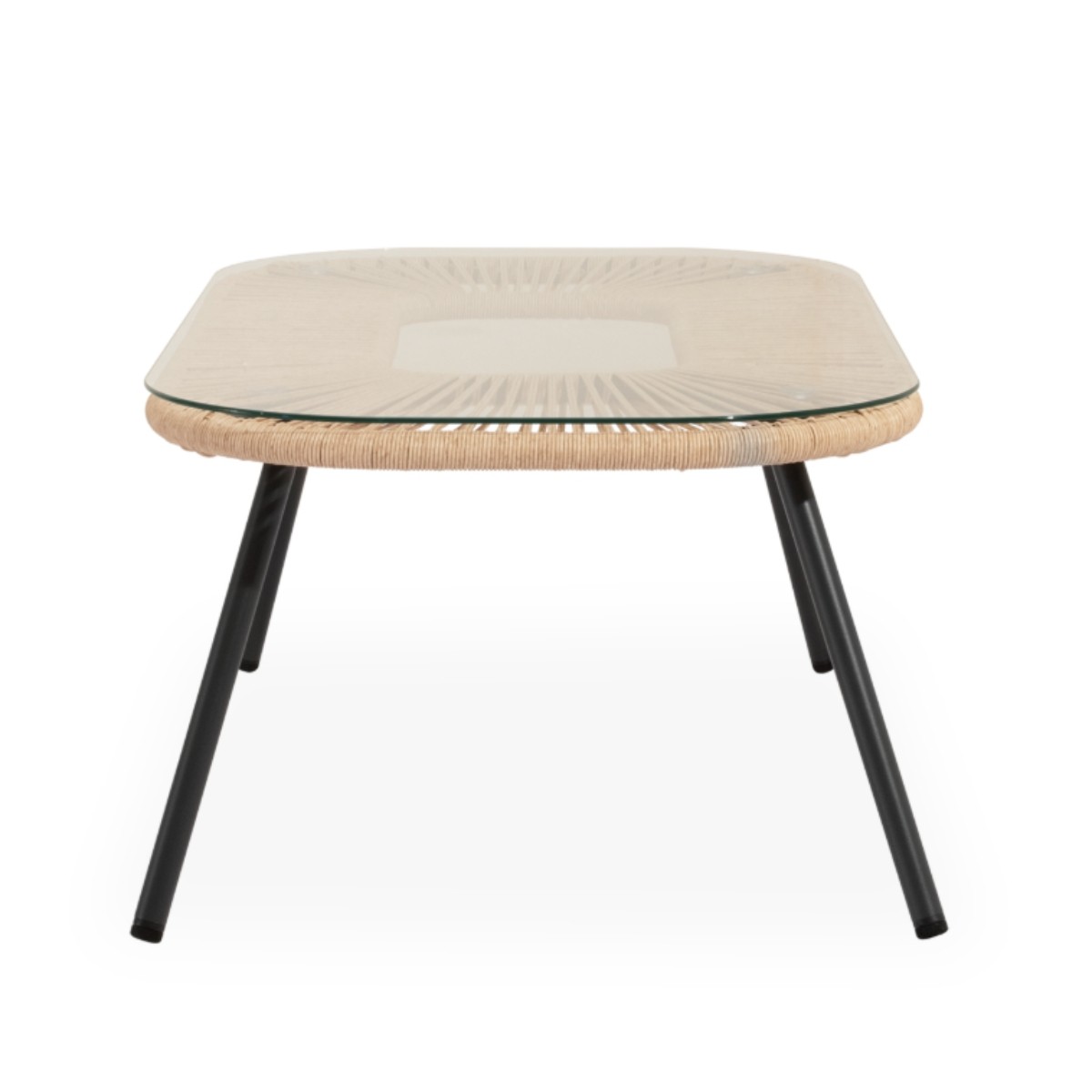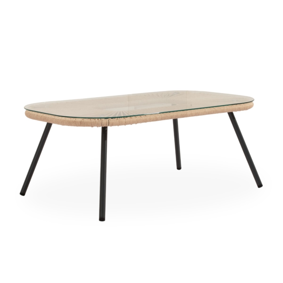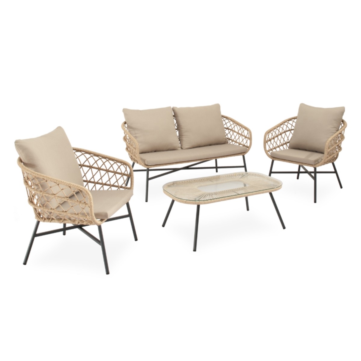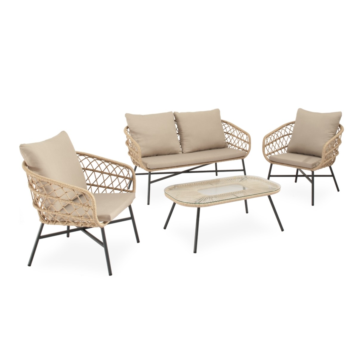 Conjunto de exterior compuesto por sofá, dos sillones y mesa con cristal templado. Estructura resistente y acabado en cuerda natural.