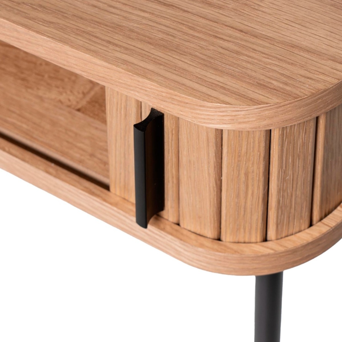 Fabricada en chapa de madera y madera de roble, ofrece un acabado cálido y sofisticado. Las patas de metal negro aportan firmeza y un contraste moderno.