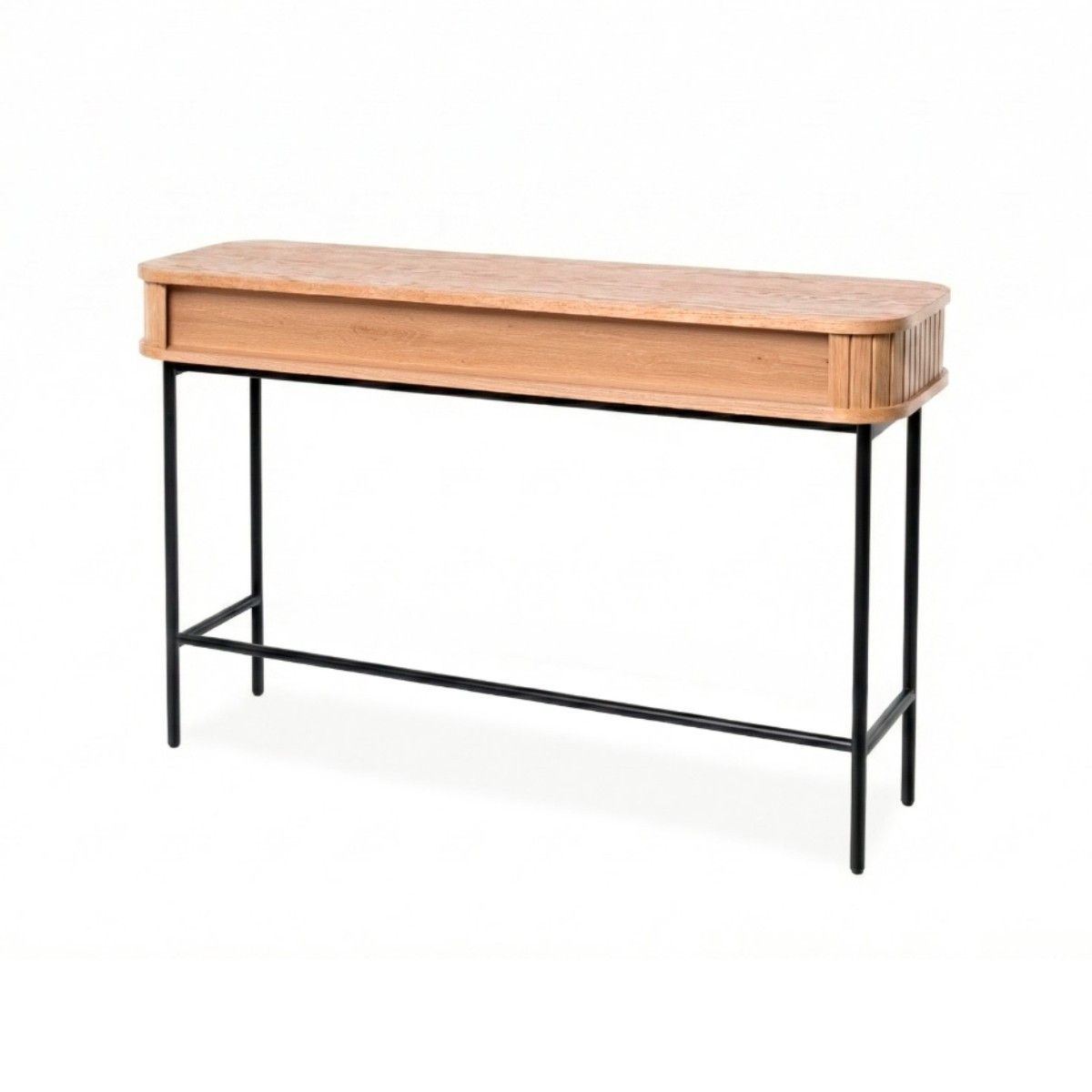 Consola fabricada en chapa de madera y roble con patas de metal negro, incluye un cajón corredero.