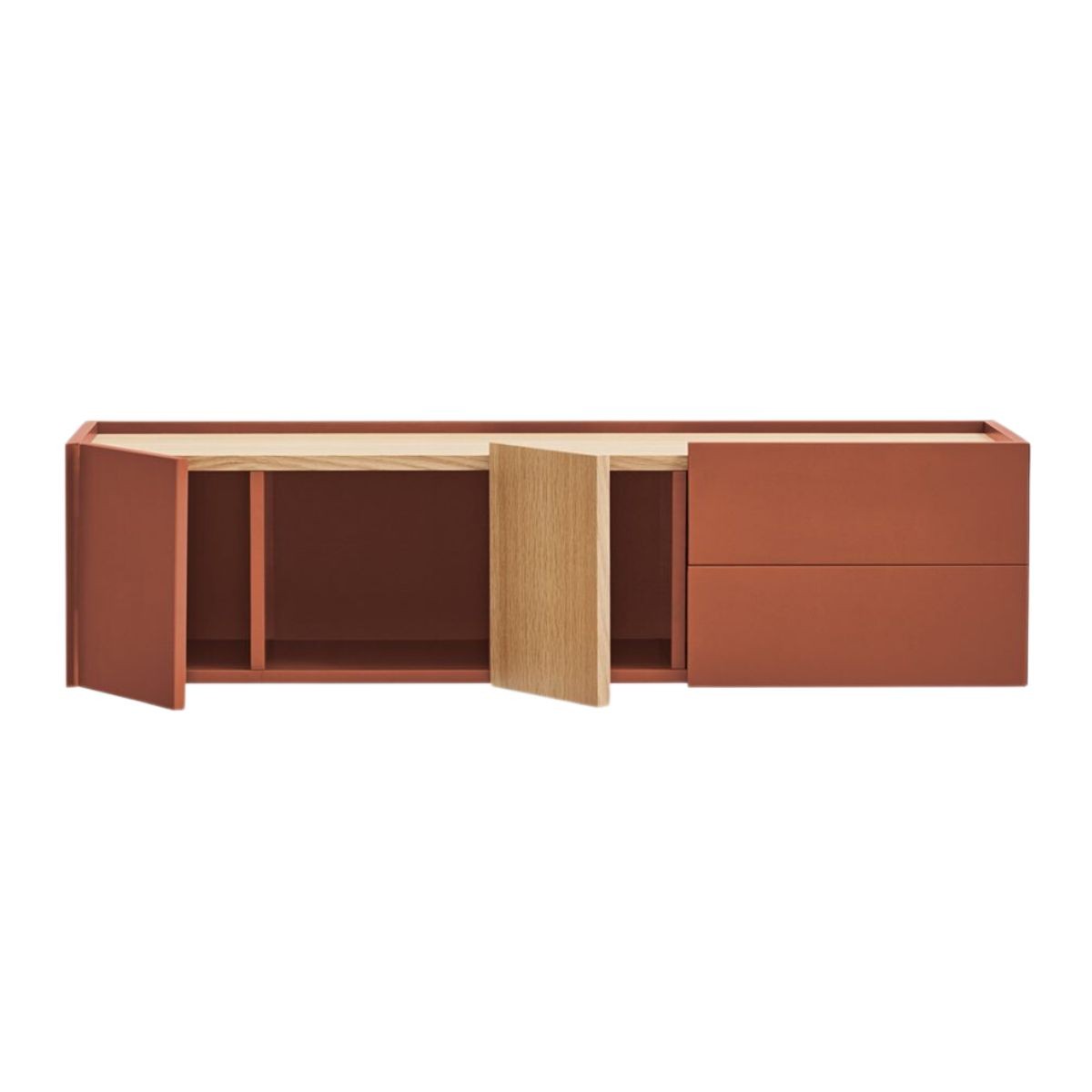 Consola de pared Otto con dos puertas y dos cajones, fabricado con MDF chapado en roble natural. ¡Disponible en 3 colores!