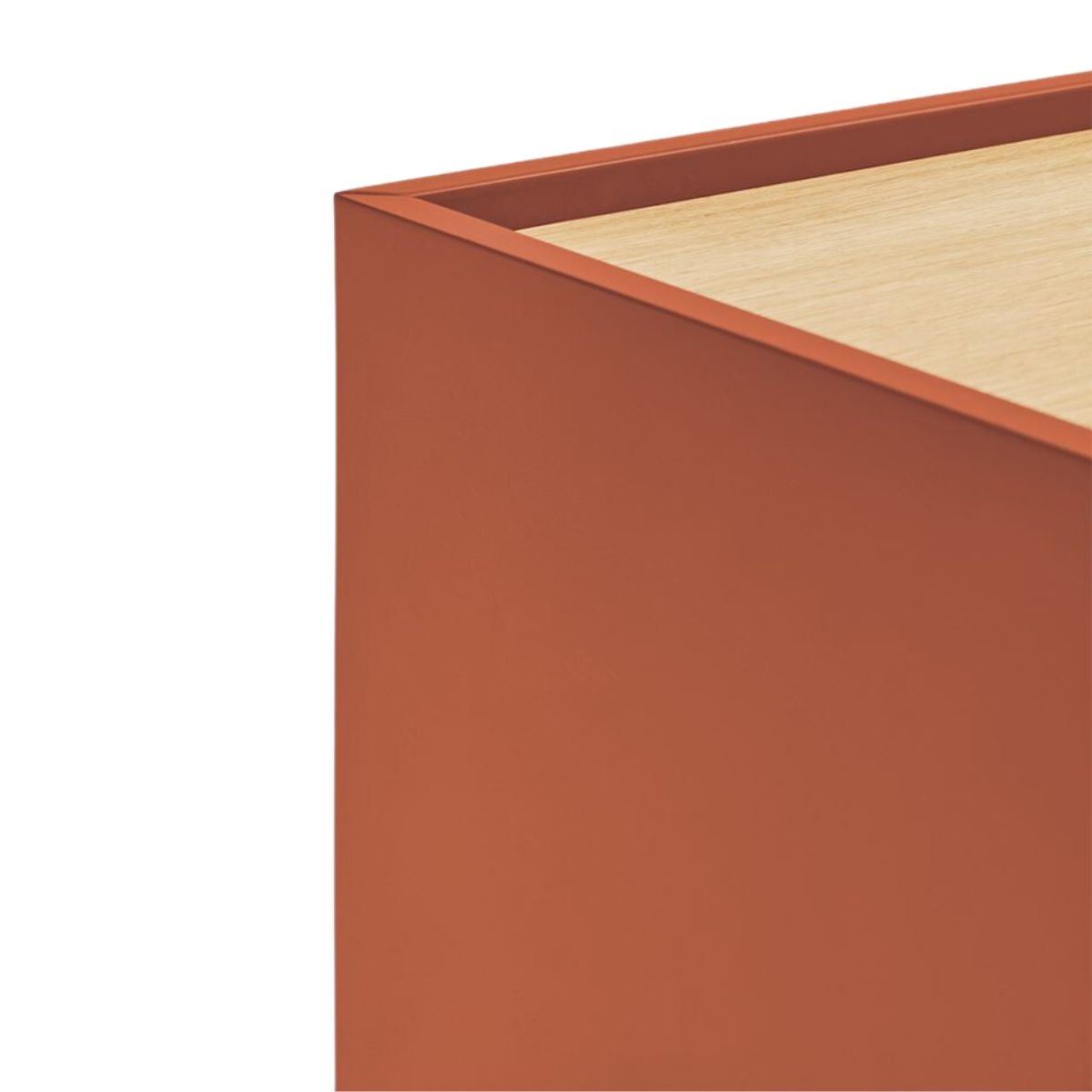 El armario está fabricado con una estructura de MDF chapado en roble natural que combina el acabado natural de la propia madera con tres colores distintos a elegir: naranja, beige y gris oscuro.