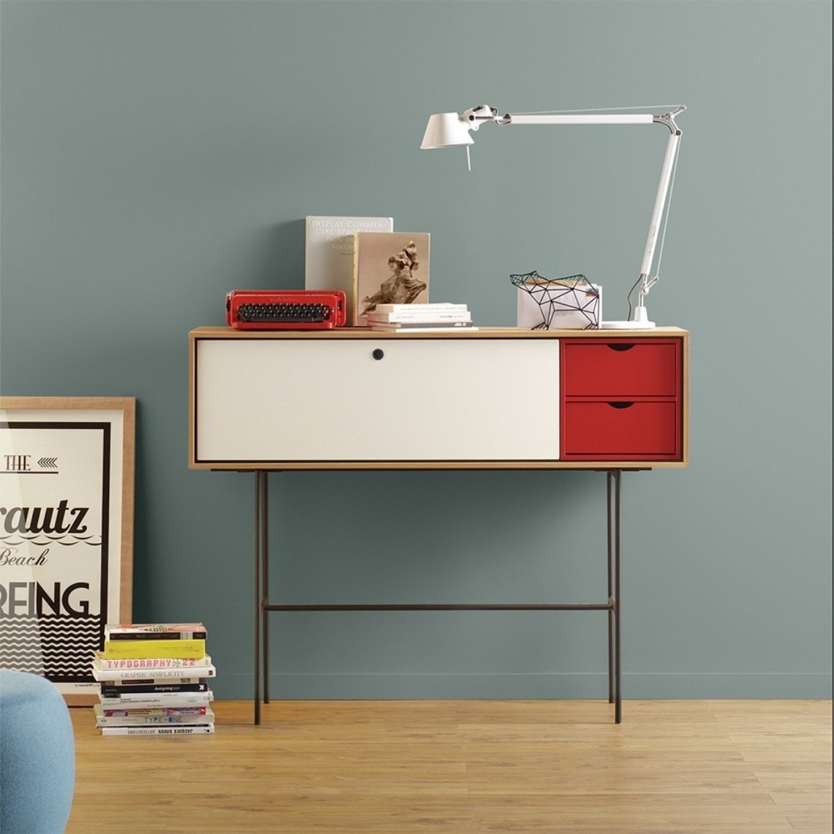 La consola S8-5 de Treku es una pieza que armoniza elegancia y utilidad en un diseño depurado y contemporáneo. Su estructura principal, fabricada en cálida madera natural —roble o nogal—, se combina con módulos frontales lacados en una amplia gama de colores personalizables.