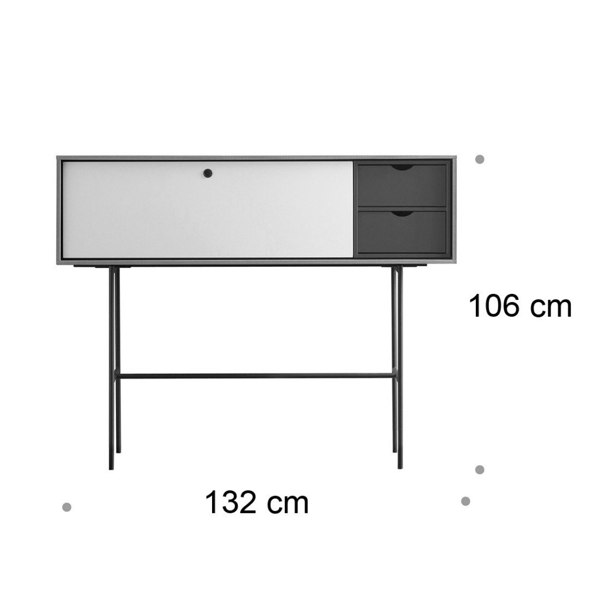 Esta consola destaca por su puerta abatible de líneas limpias y sus sutiles uñeros integrados, ofreciendo una solución funcional para el almacenamiento sin renunciar al estilo.