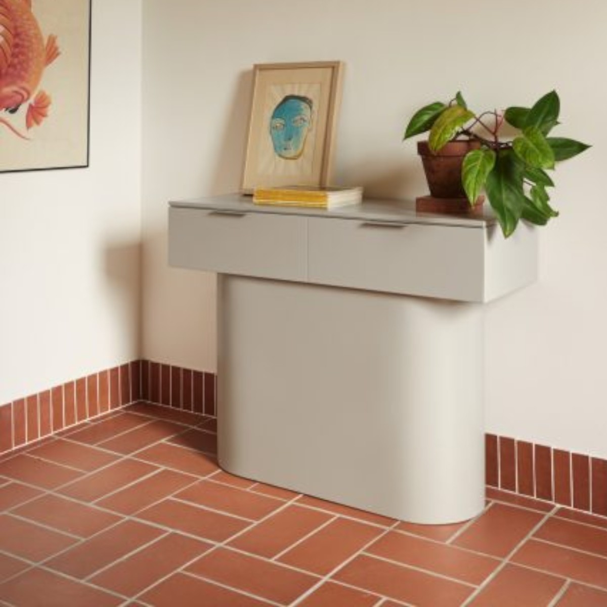 La consola Totem de Teulat destaca por su diseño escultórico y su estructura lacada de líneas precisas. Ofrece dos cajones integrados y un elegante pie central. Disponible en varios colores.