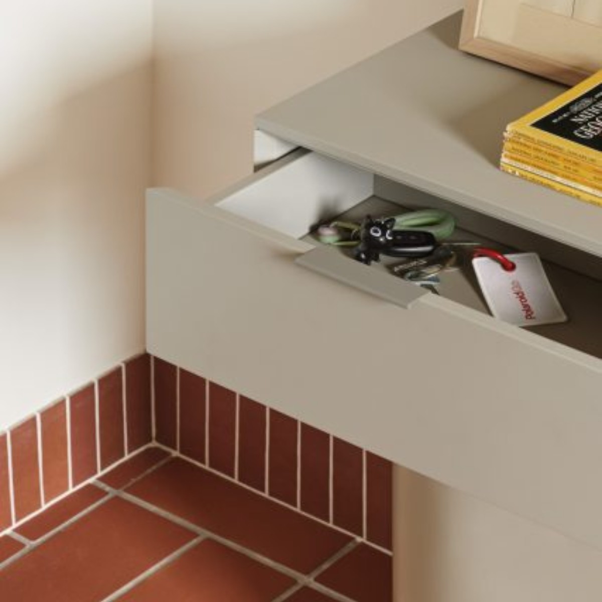 Su estructura en MDF lacado aporta una superficie uniforme y sofisticada, disponible en diversos tonos para integrarse con distintos estilos decorativos. Además, incorpora dos amplios cajones que permiten mantener el orden sin romper la pureza visual de la pieza.