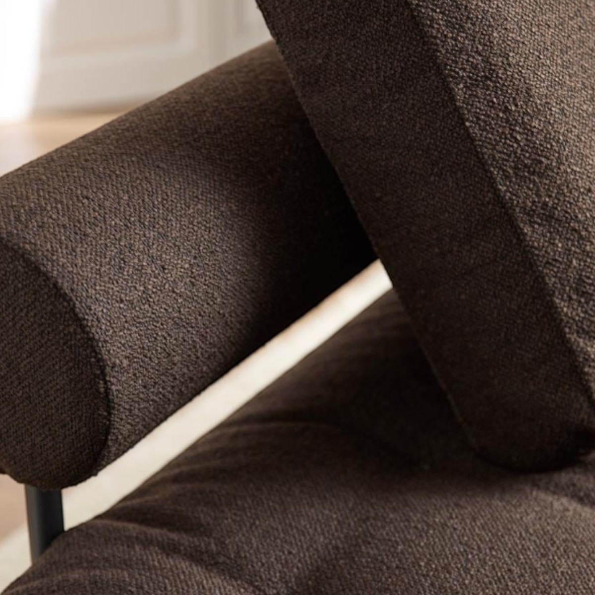 Su estructura de acero negro mate, combinada con patas de roble lacado, aporta un equilibrio perfecto entre resistencia y calidez.