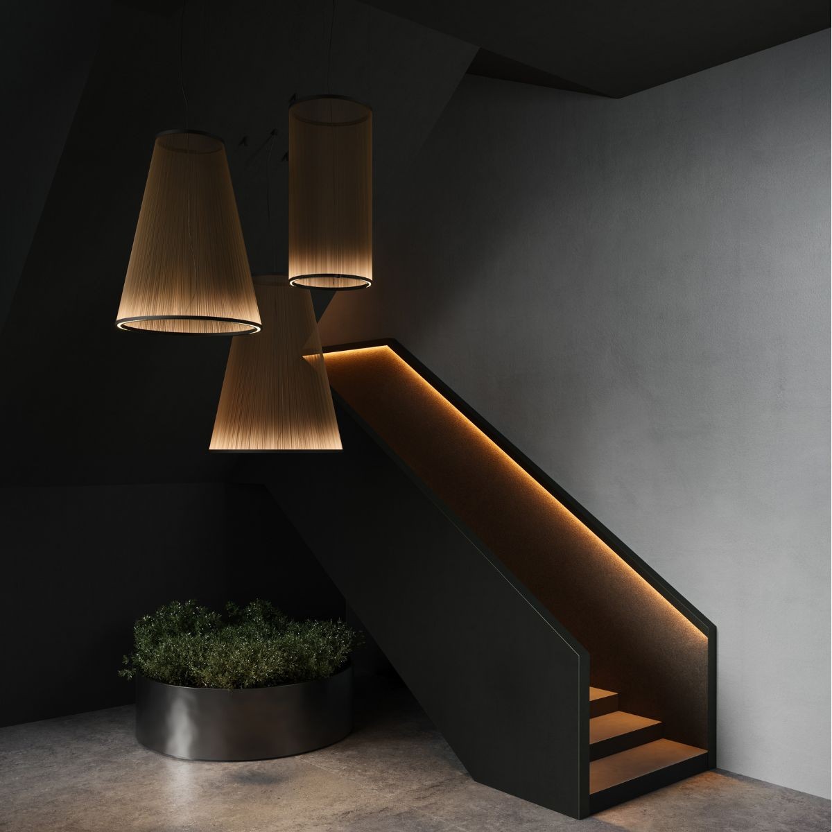 Además, la base cónica está fabricada con aluminio resistente con pequeños hilos que dejan el espacio suficiente para una distribución óptima de la luz y una sensación de movimiento.