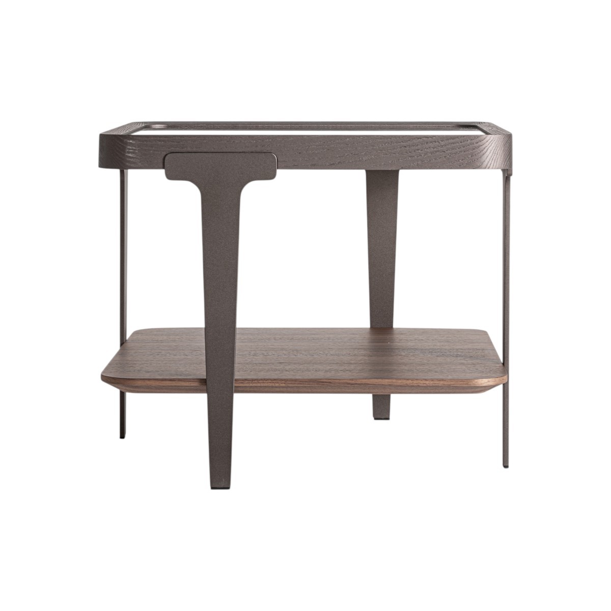 Mesita auxiliar de diseño contemporáneo con estética ligera y elegante. Combina madera de fresno, cristal ahumado y estructura metálica negra.
