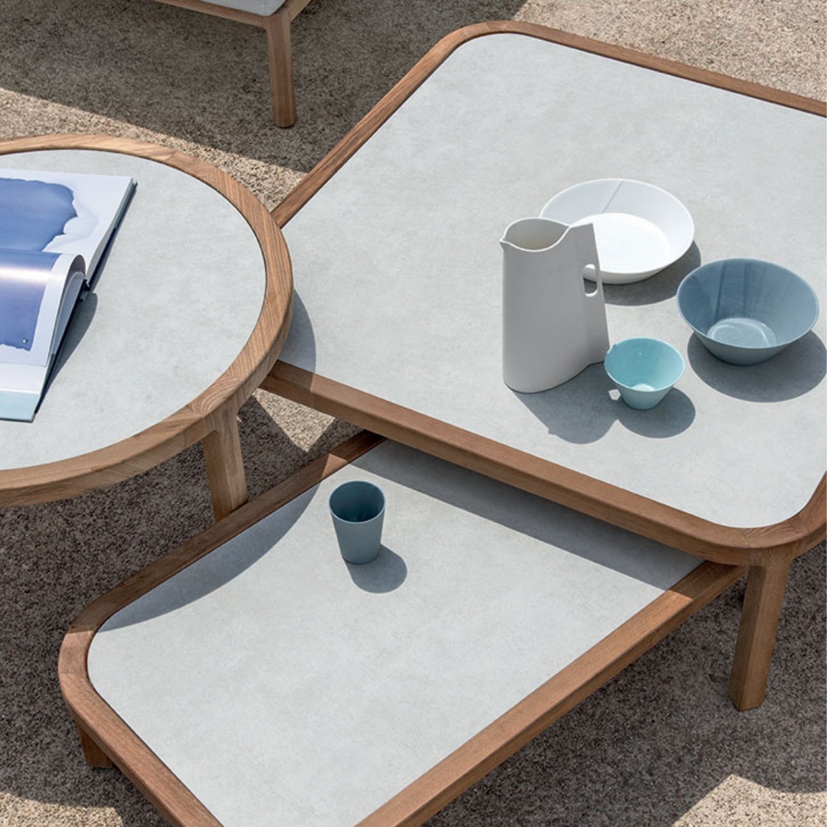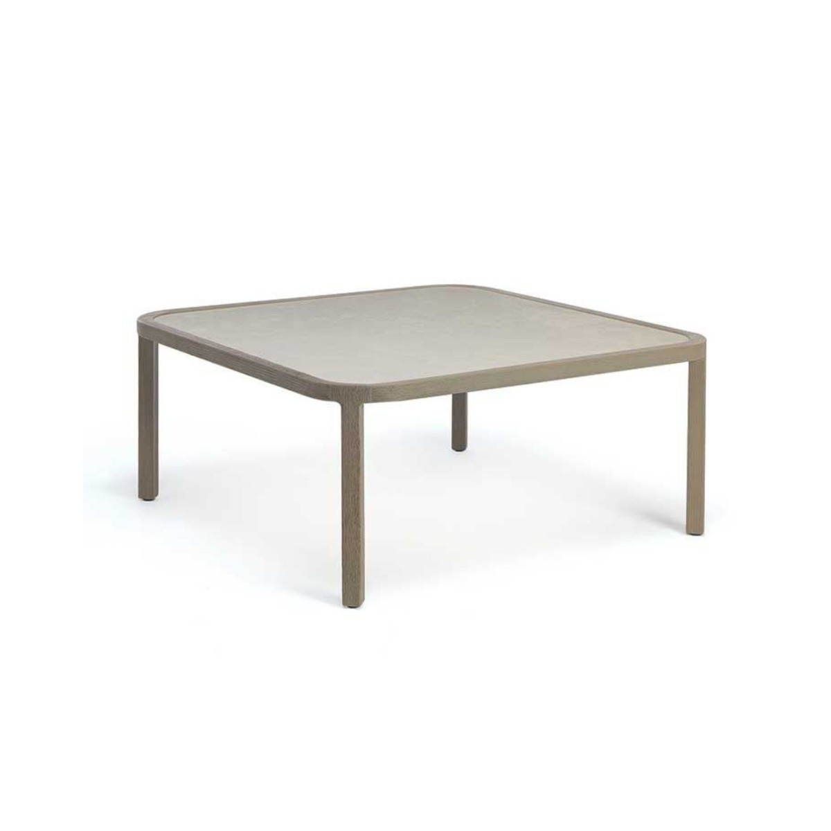 Mesa de centro cuadrada exterior Grand Life con estructura de madera maciza y sobre de cerámica.