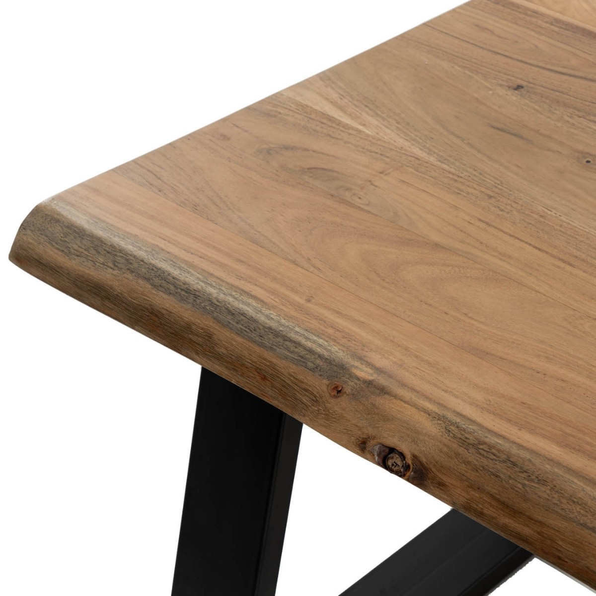 Su superficie está elaborada en madera de acacia, un material noble que revela vetas y matices únicos en cada pieza, aportando autenticidad y calidez al ambiente.