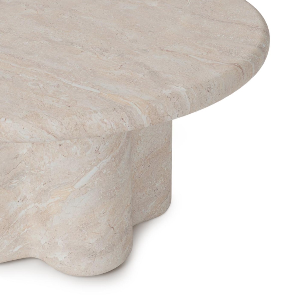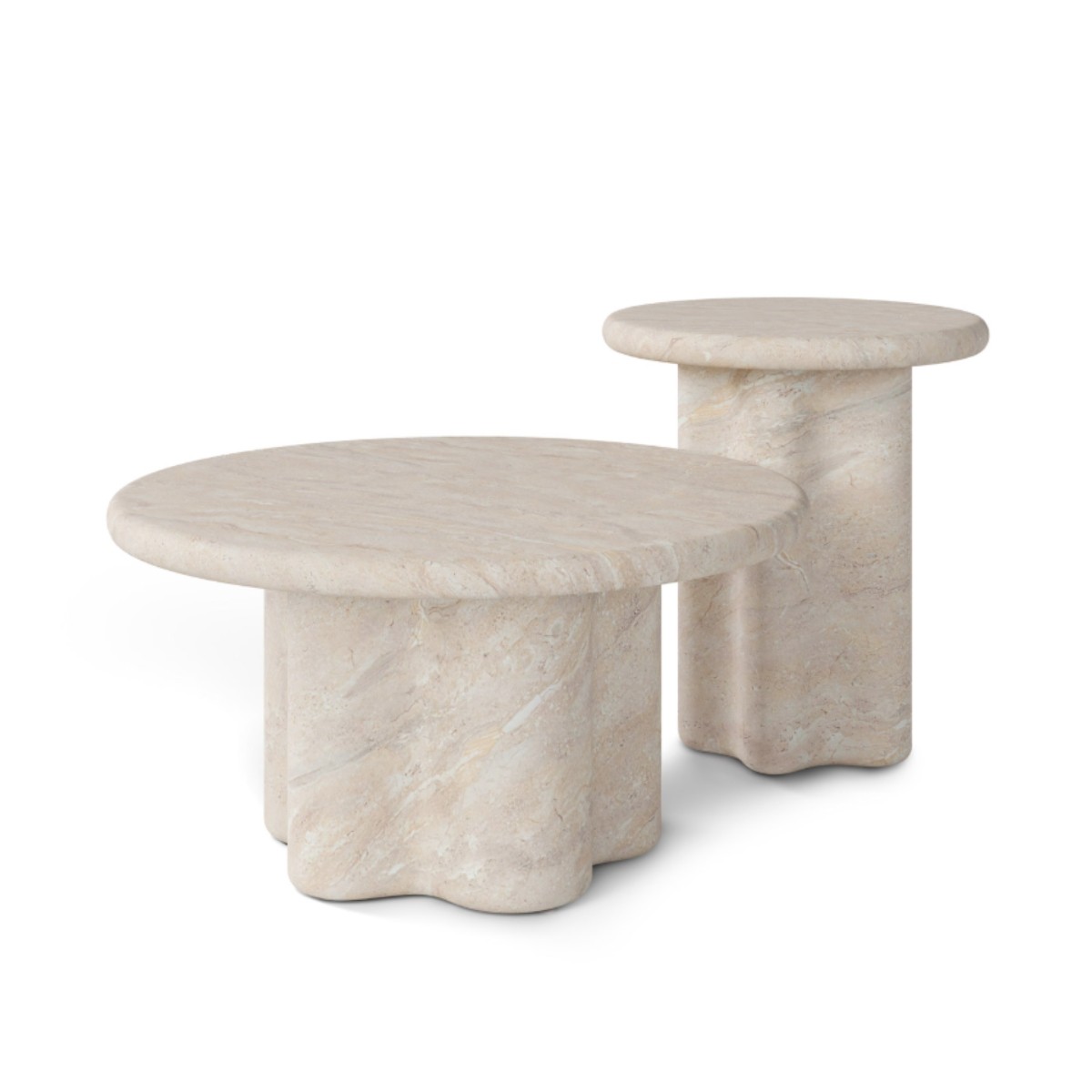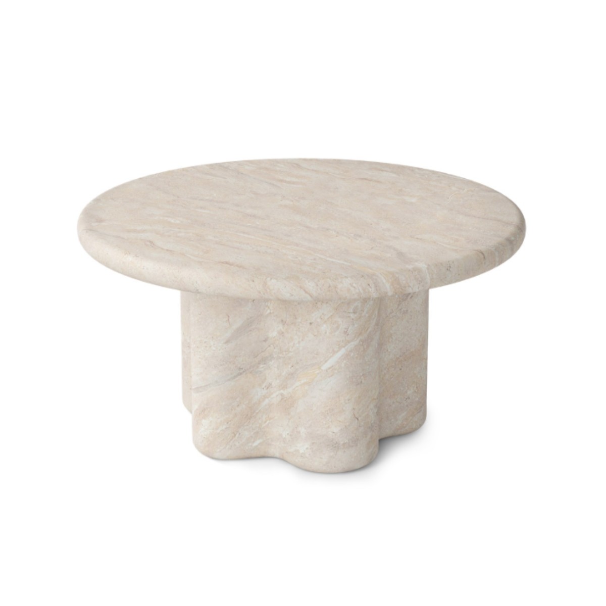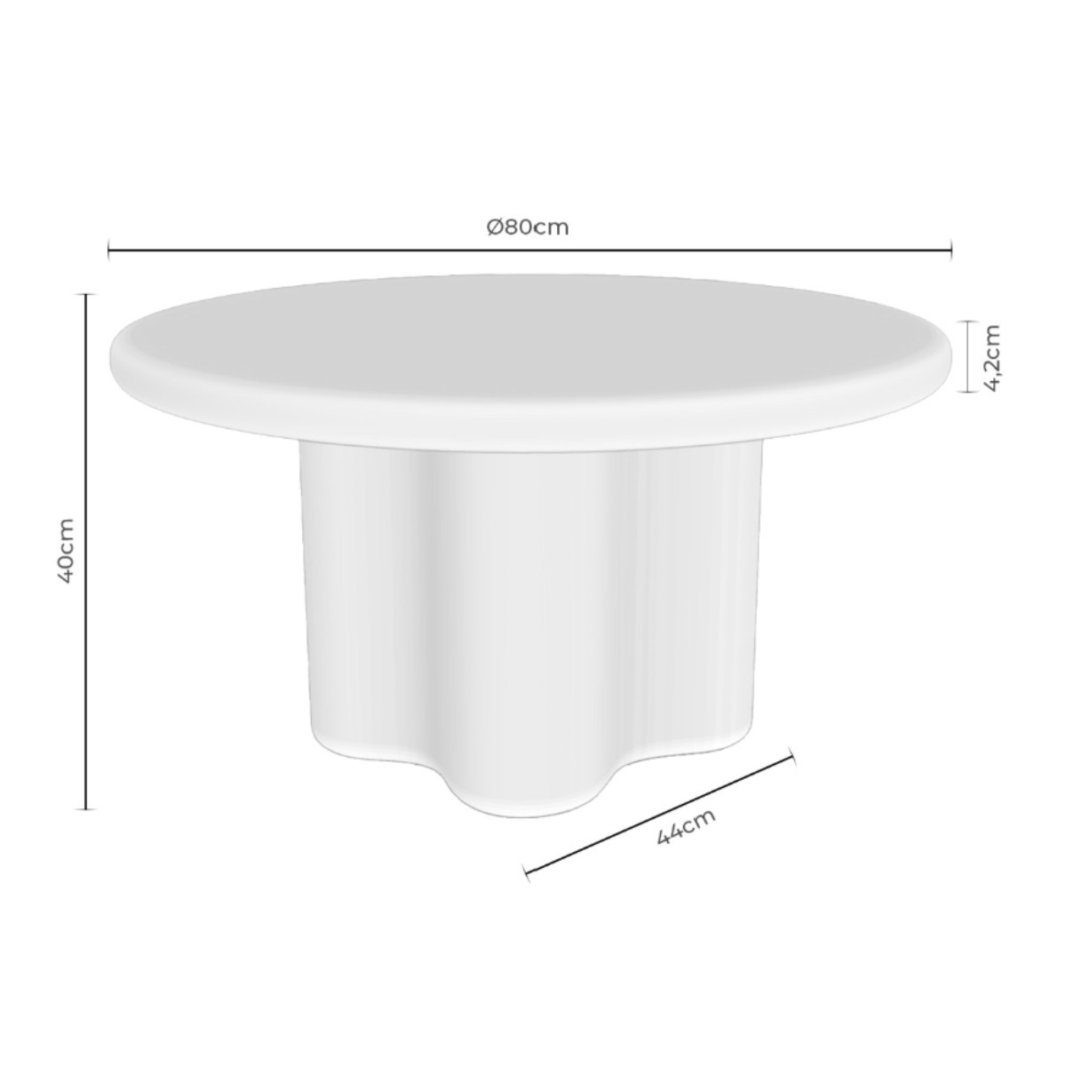Mesa de centro en cemento GFRC con acabado efecto travertino, resistente y elegante. Apta para interior y exterior cubierto.