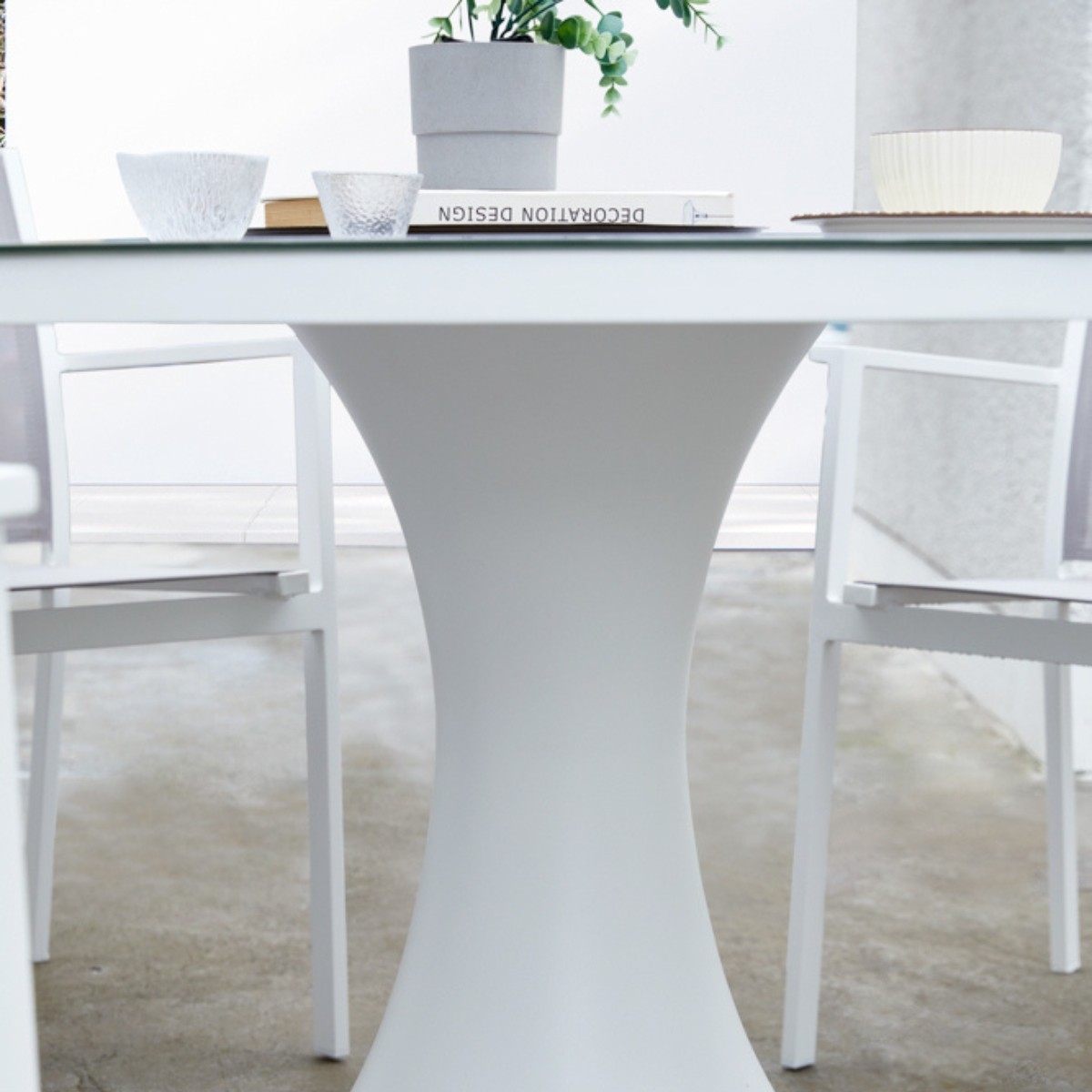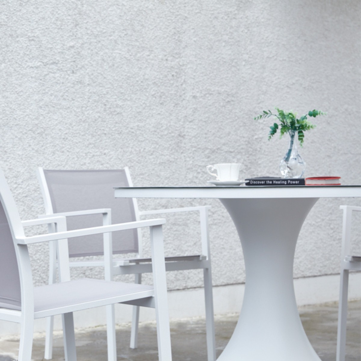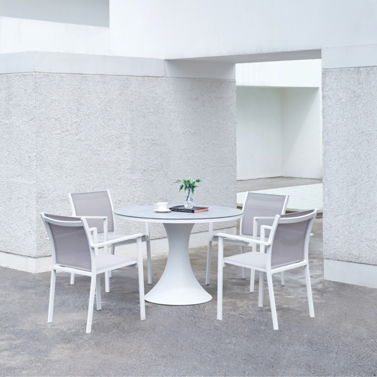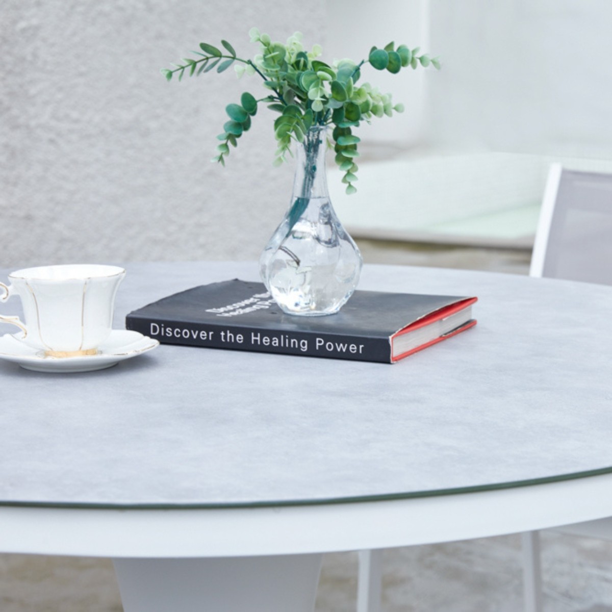 Mesa de exterior disponible en dos medidas, con estructura de aluminio blanco y sobre cerámico texturizado en gris claro.