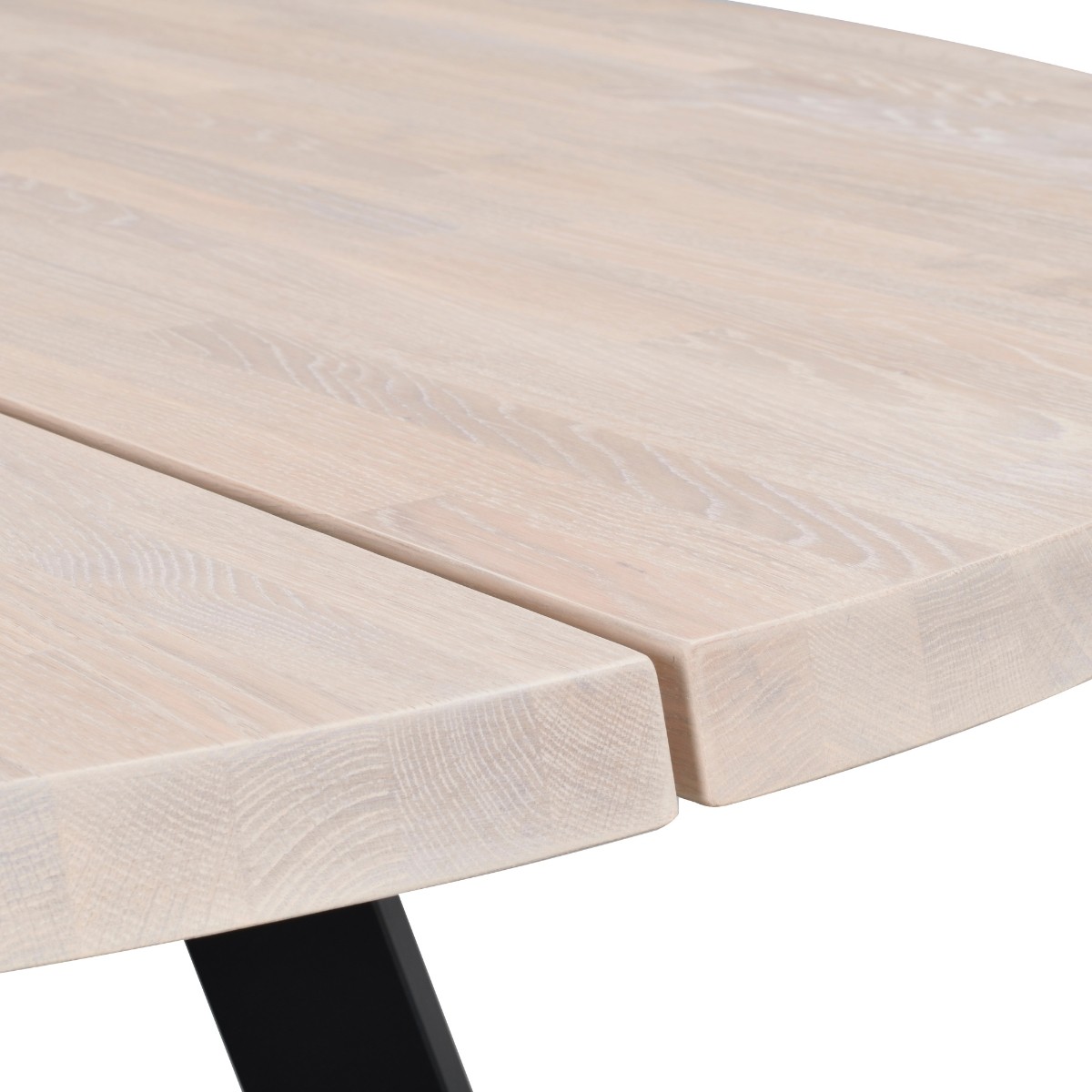 Su tablero de dos piezas de roble macizo combina un acabado blanqueado y marrón oscuro, resaltado con un elegante bisel y una superficie cepillada que realza las vetas naturales de la madera. Disponible también en fresno negro.
