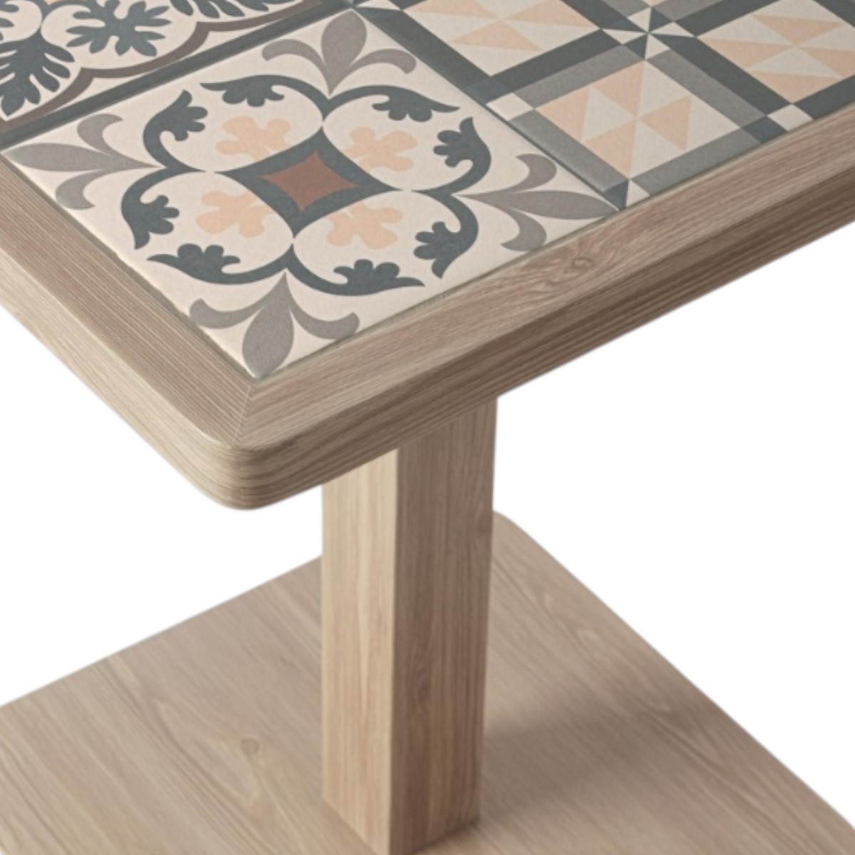 Su estructura combina un sobre con mosaico de porcelana esmaltada fabricada en España, que aporta carácter y fácil mantenimiento, con una columna central de aluminio recubierta con pintura en polvo de poliéster, pensada para soportar el uso al aire libre.