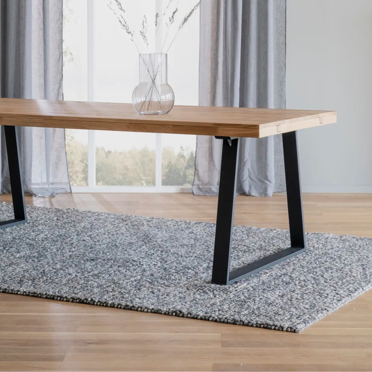 La mesa de comedor con hoja extensible Brooklyn 200 de Rowico destaca por su diseño robusto y sofisticado. Fabricada con roble europeo macizo y patas en U de metal negro.
