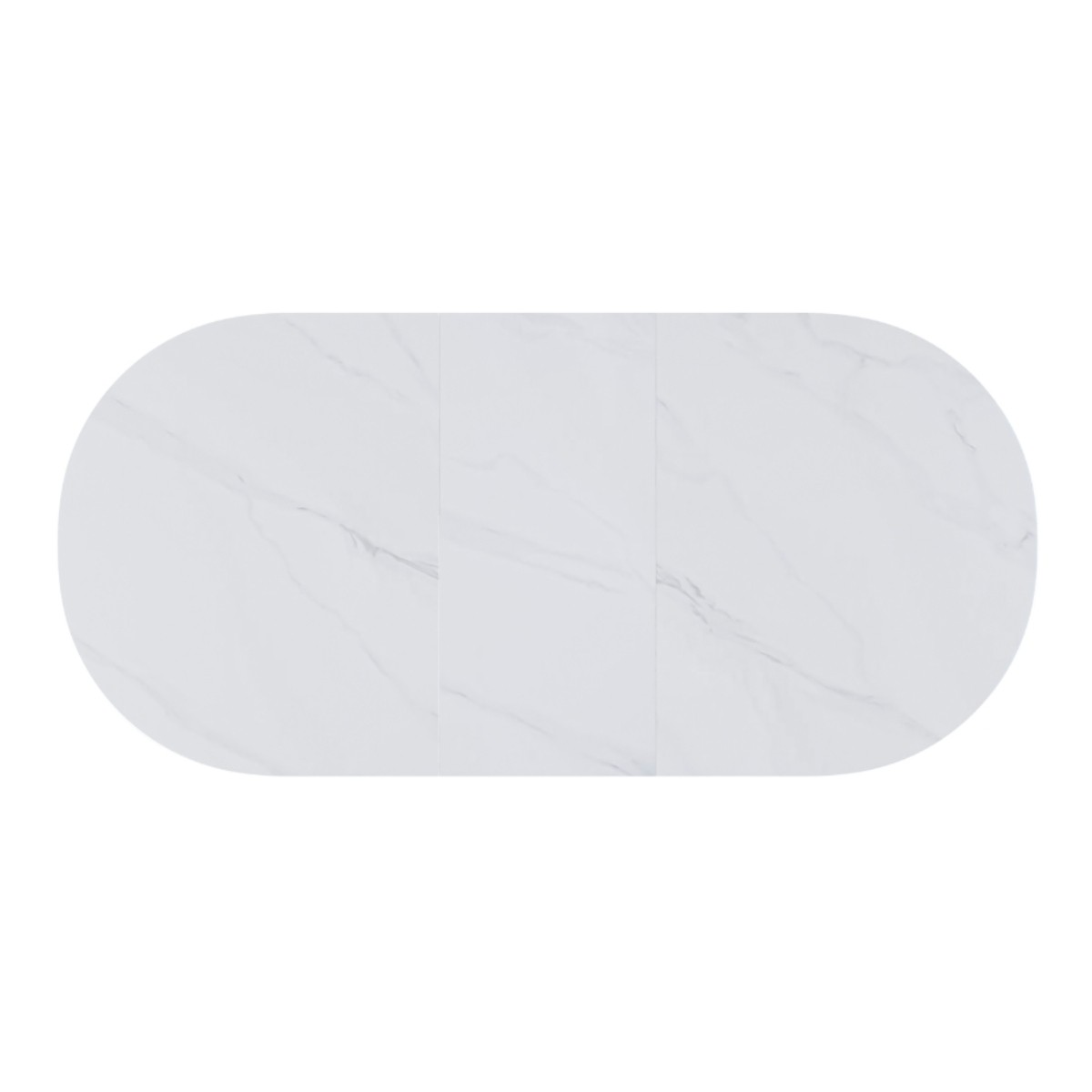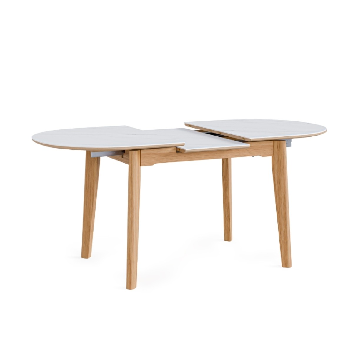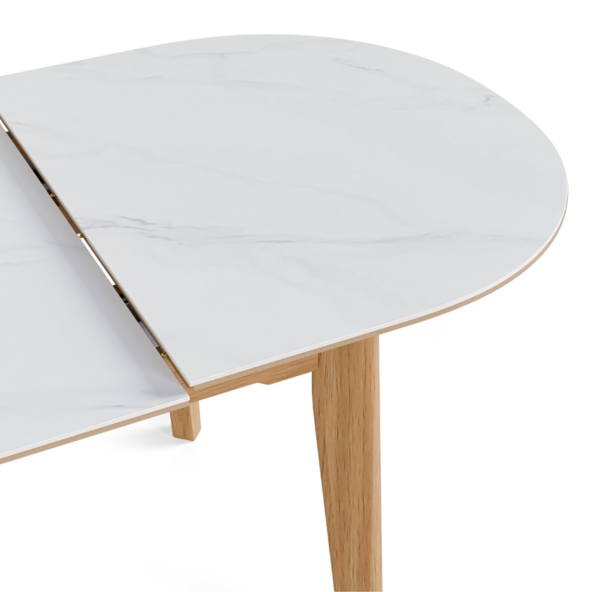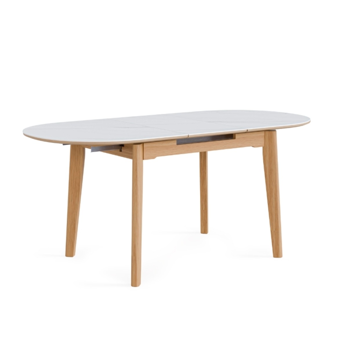 Mesa ovalada extensible con tapa porcelánica blanca y patas de madera maciza.