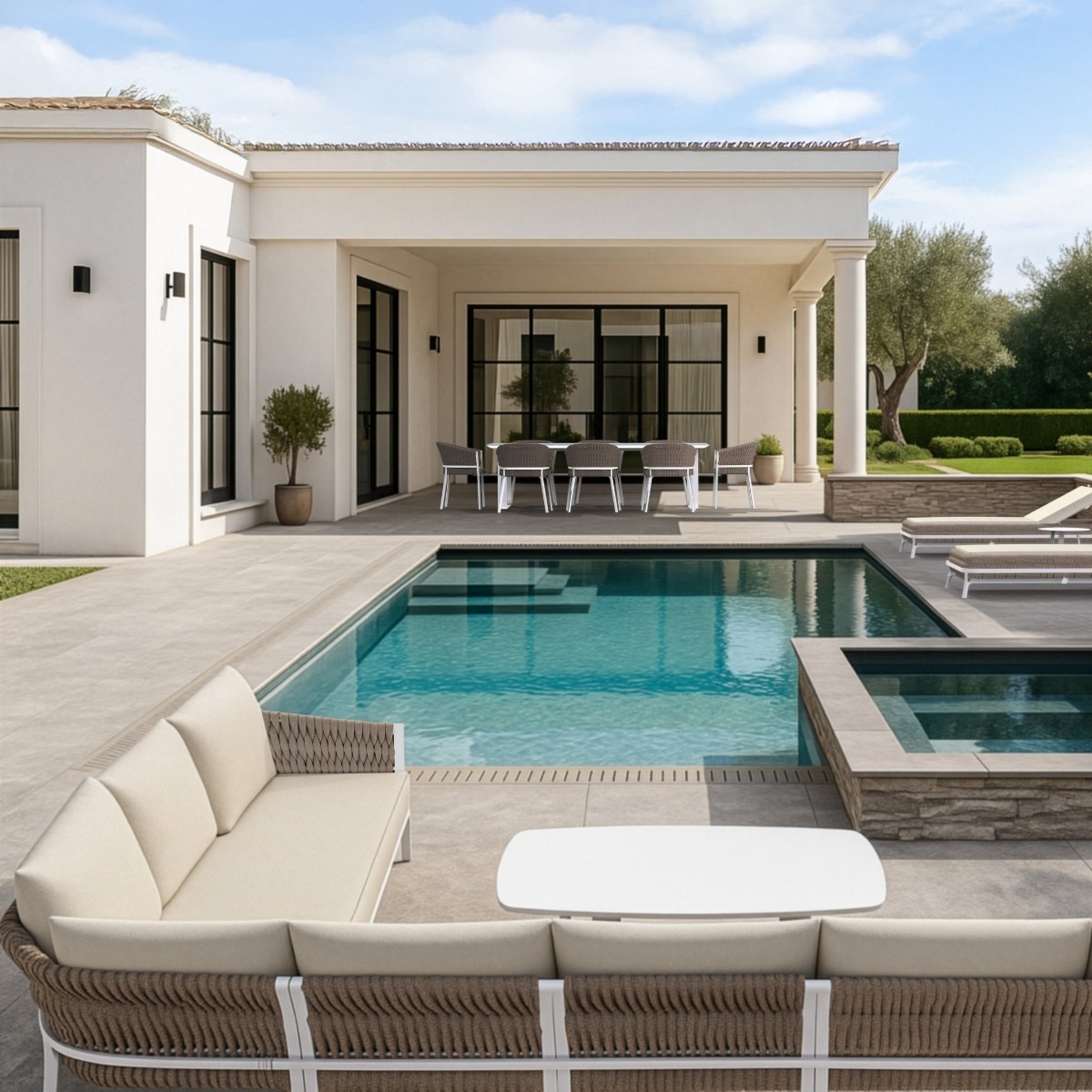 El trenzado en cuerda de olefina en tono neutro aporta textura y un estilo contemporáneo, además de ser altamente resistente al uso exterior.