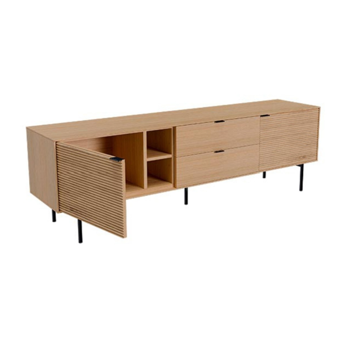 Mueble TV de 180 cm con amplio espacio de almacenaje, diseño contemporáneo y acabados en roble natural. Combina puertas, cajones y hueco abierto.