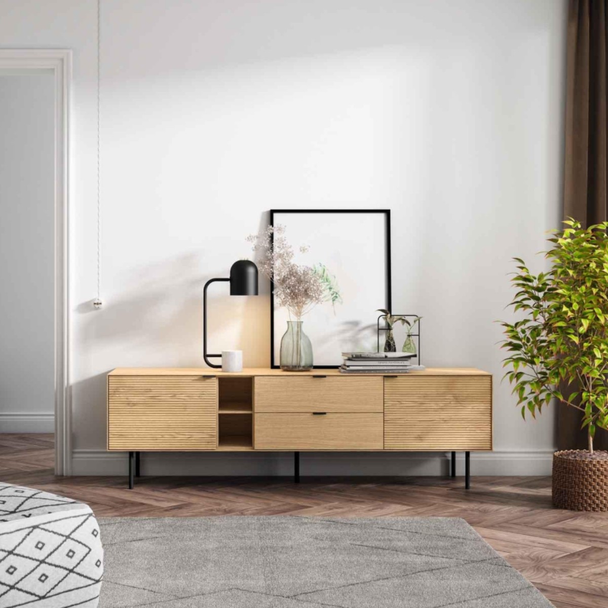 El mueble de TV Tulsa de 180 cm destaca por su equilibrio entre estética moderna y calidez natural, convirtiéndose en una pieza clave para el salón.