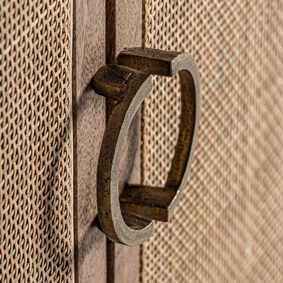El mueble de TV Beckley combina madera de mango y mimbre en un acabado cálido y artesanal. Con estructura desmontable y pasacables.
