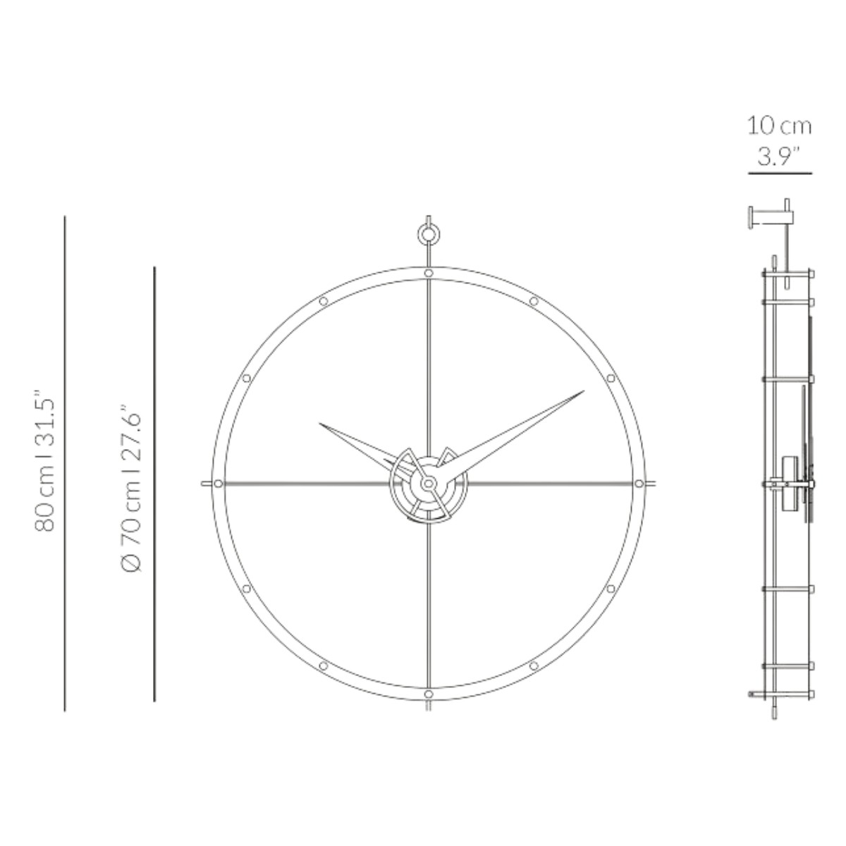 Su estructura se compone de dos anillos concéntricos de acero inoxidable que crean una sensación de ligereza visual y equilibrio geométrico. Los sutiles acentos en tono dorado aportan un matiz elegante y refinado, mientras que las agujas de madera maciza con acabado wengué introducen calidez y contraste.