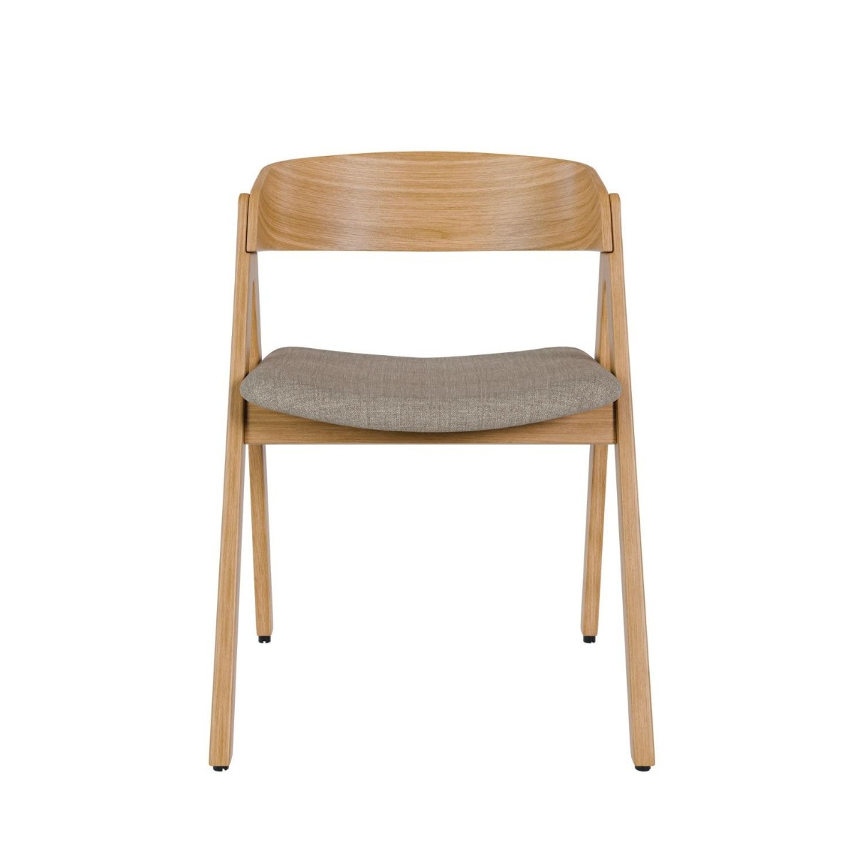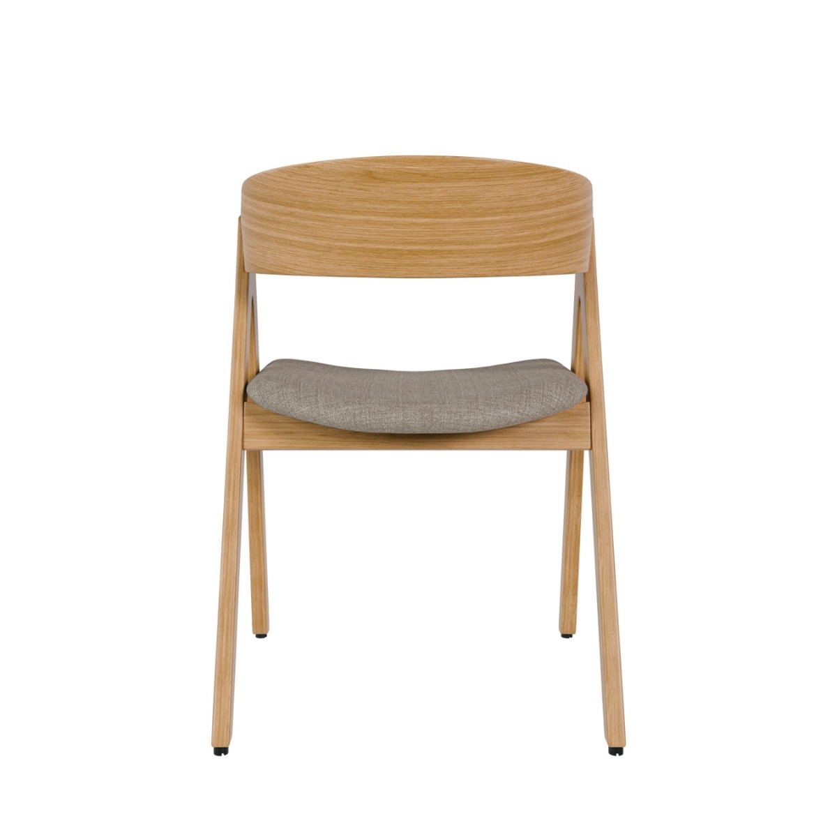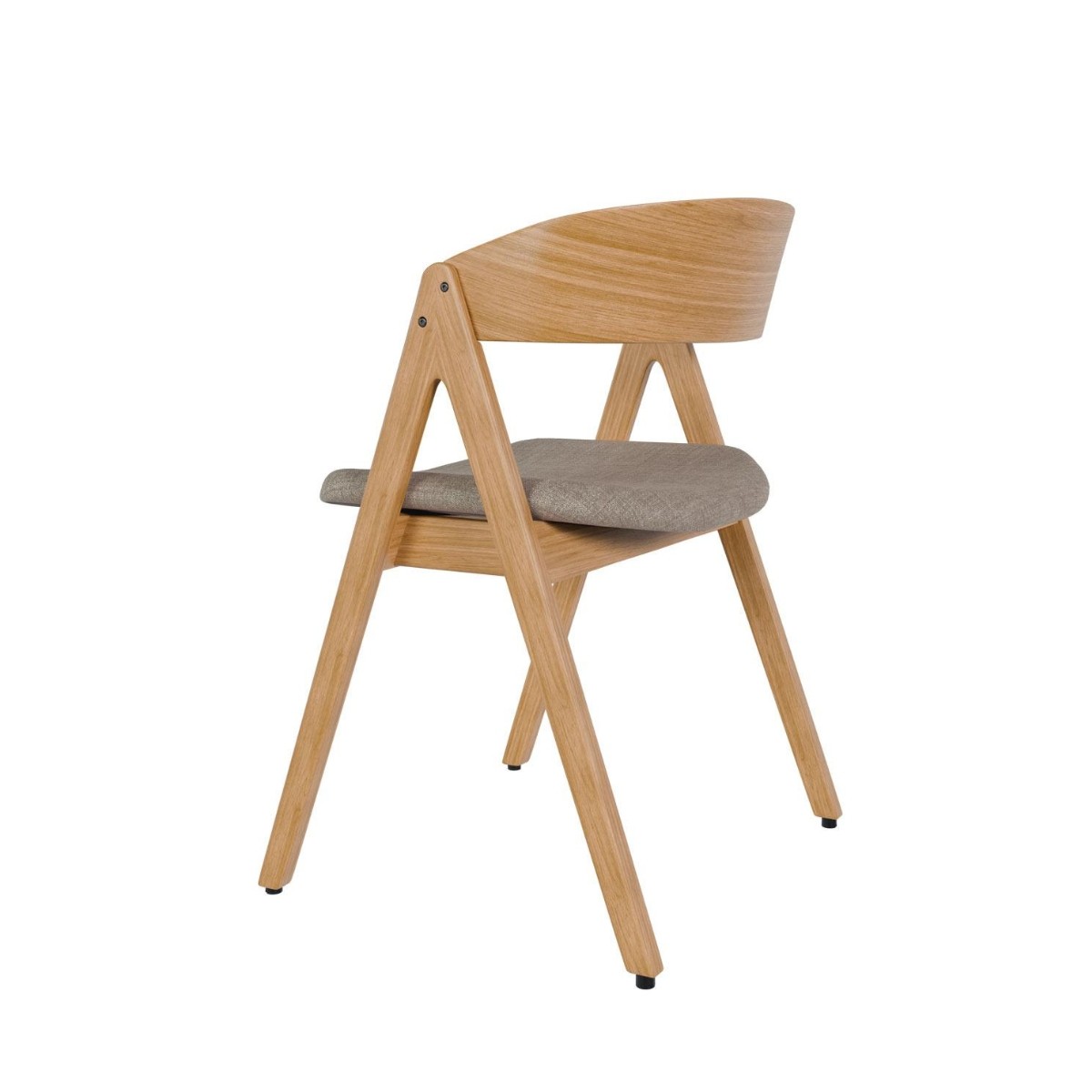 Silla comedor Rina fabricada en madera de roble con un cómodo respaldo curvado. De diseño atemporal, tiene unas patas en forma de tijera. Tapizada en tejidos de colores a elegir.