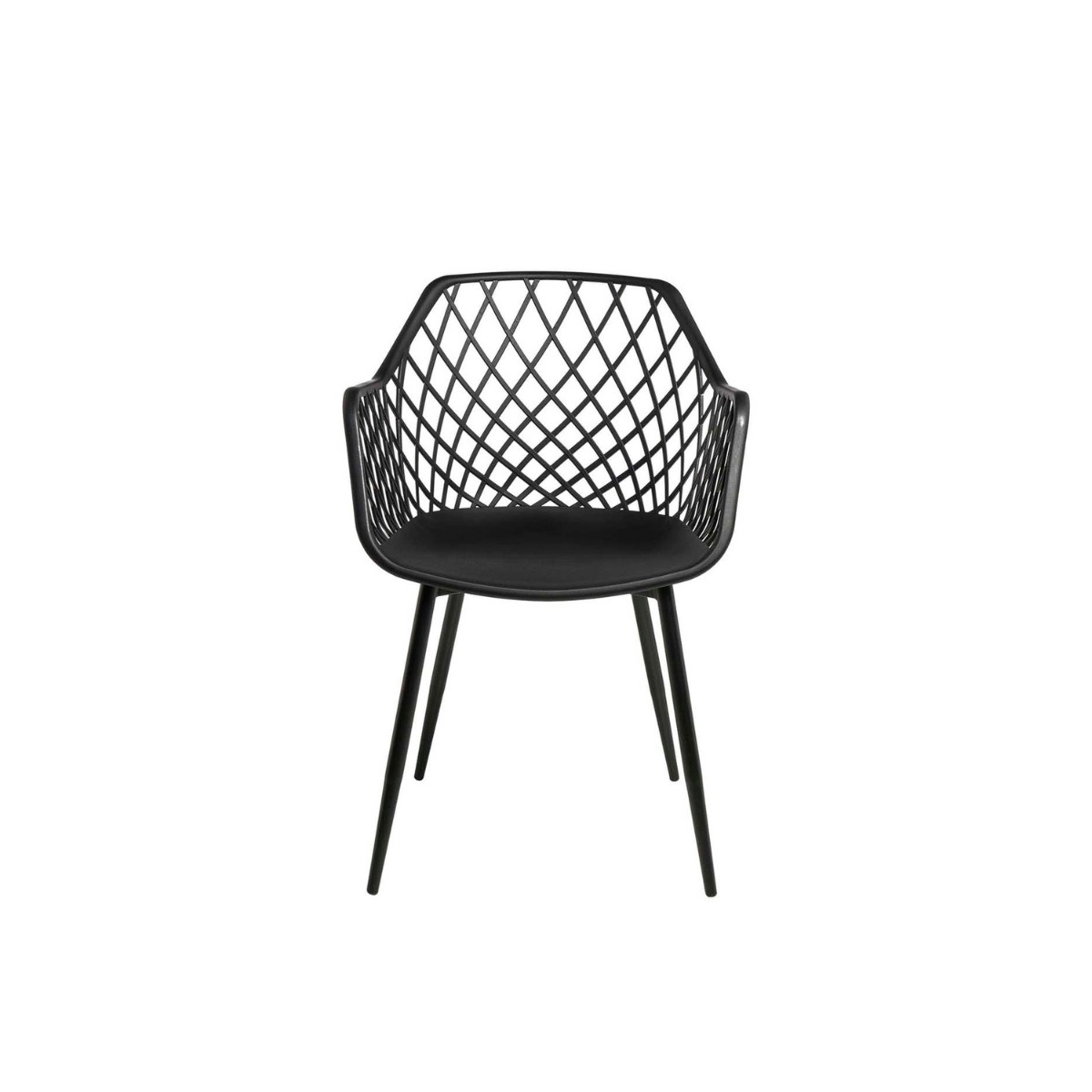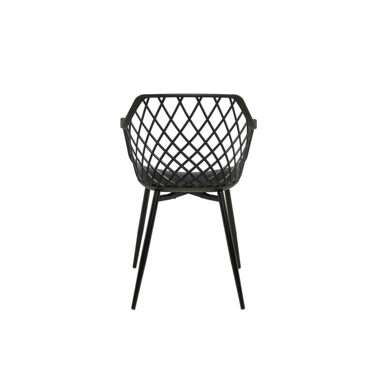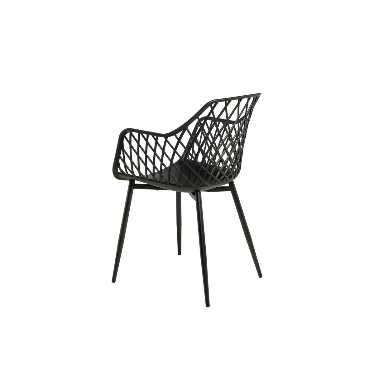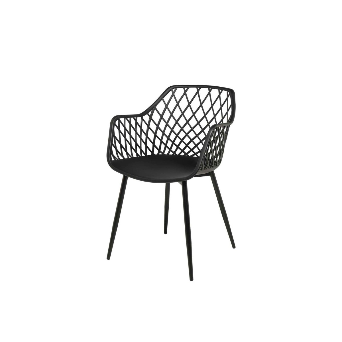 Silla de exterior con diseño de rejilla moderno. Fabricada en polipropileno resistente y patas metálicas. Ideal para terrazas, jardines y espacios de hostelería.