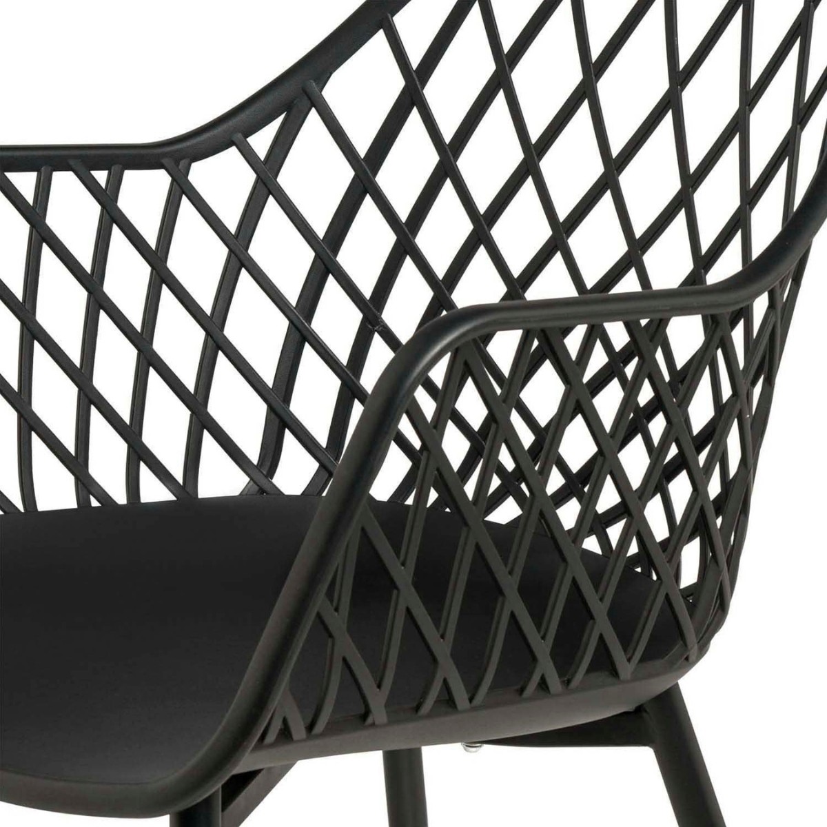 Su estructura combina líneas modernas con un atractivo diseño de rejilla en respaldo y reposabrazos, lo que le aporta un aire sofisticado y dinámico a cualquier ambiente exterior.