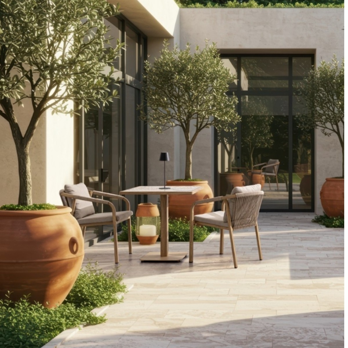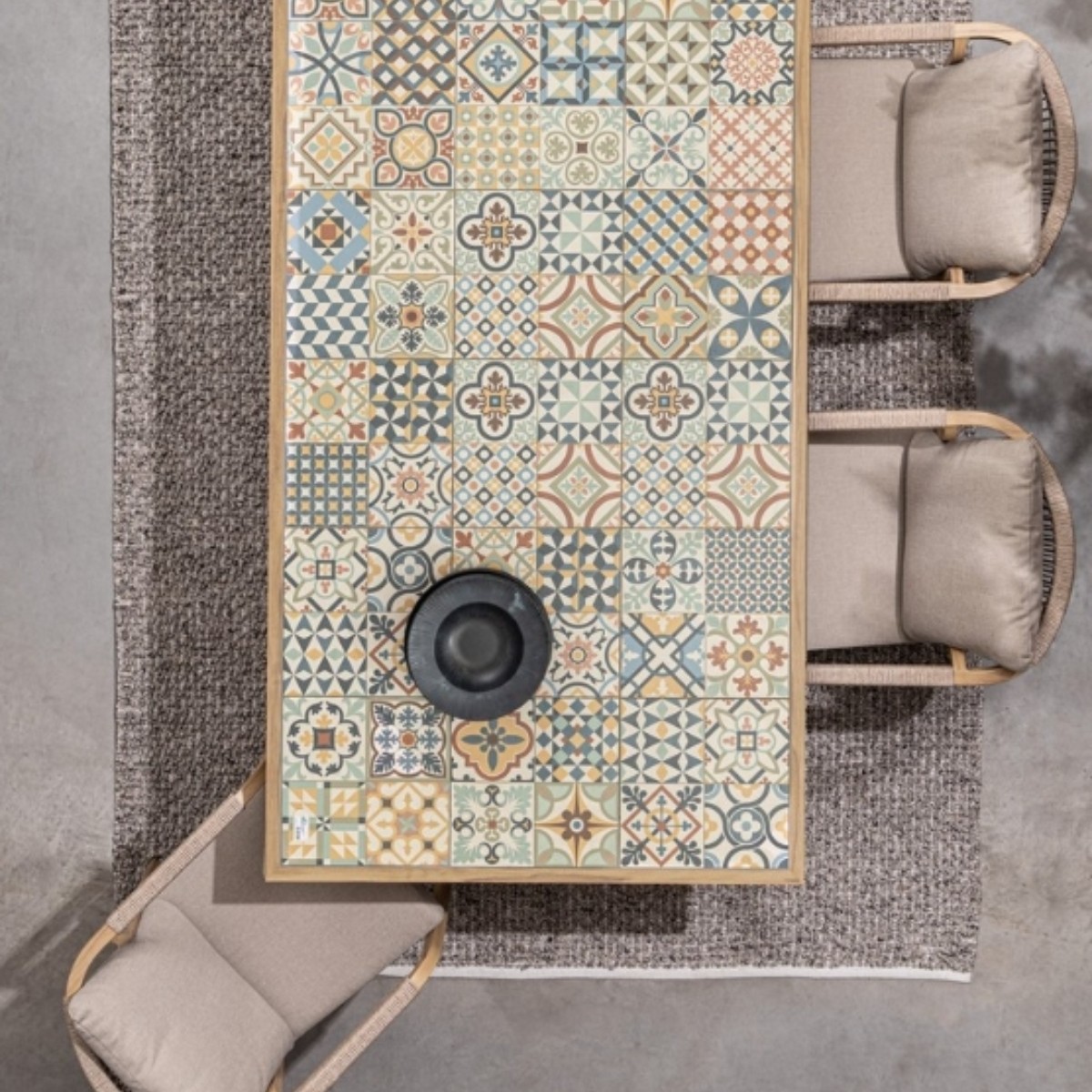 Incluye cojines desenfundables en asiento y respaldo, confeccionados en tejido Olefin 100% polipropileno, especialmente pensado para uso exterior gracias a su capacidad para repeler la humedad y conservar el color.