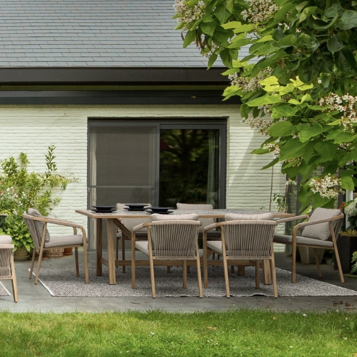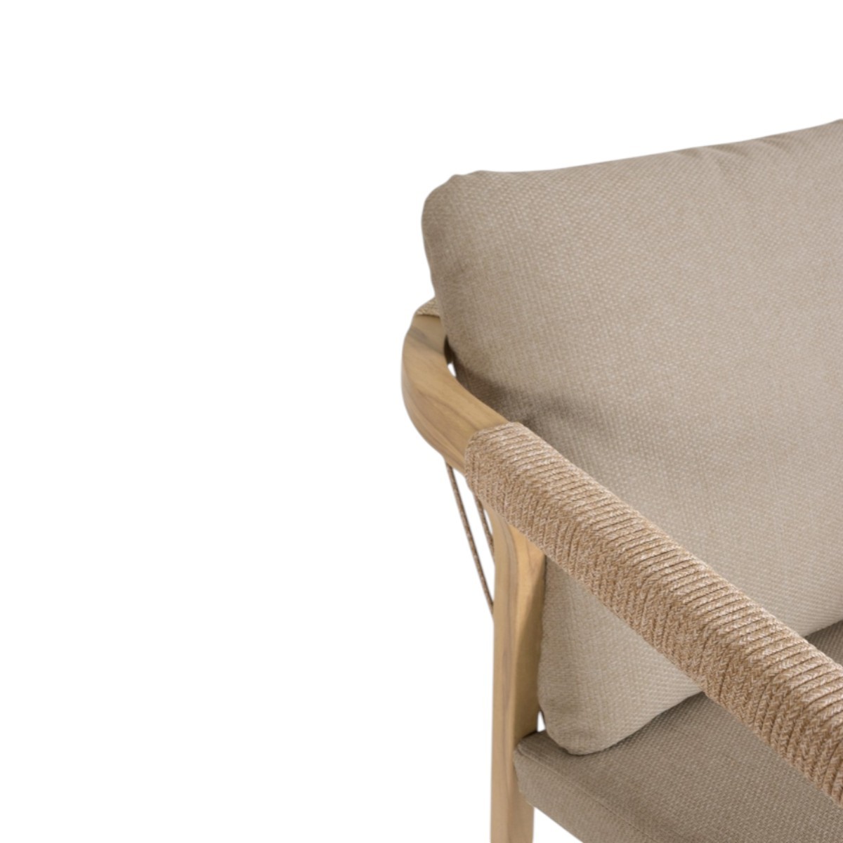 El respaldo y los reposabrazos incorporan un entramado de cuerda redonda que añade textura, confort y un atractivo aire artesanal.