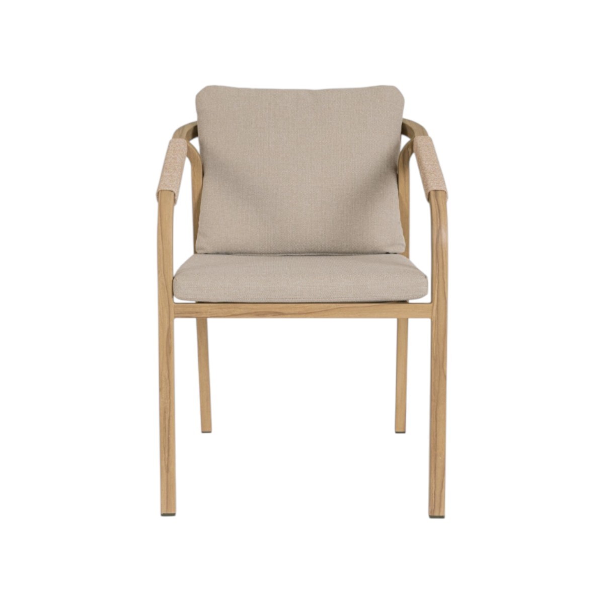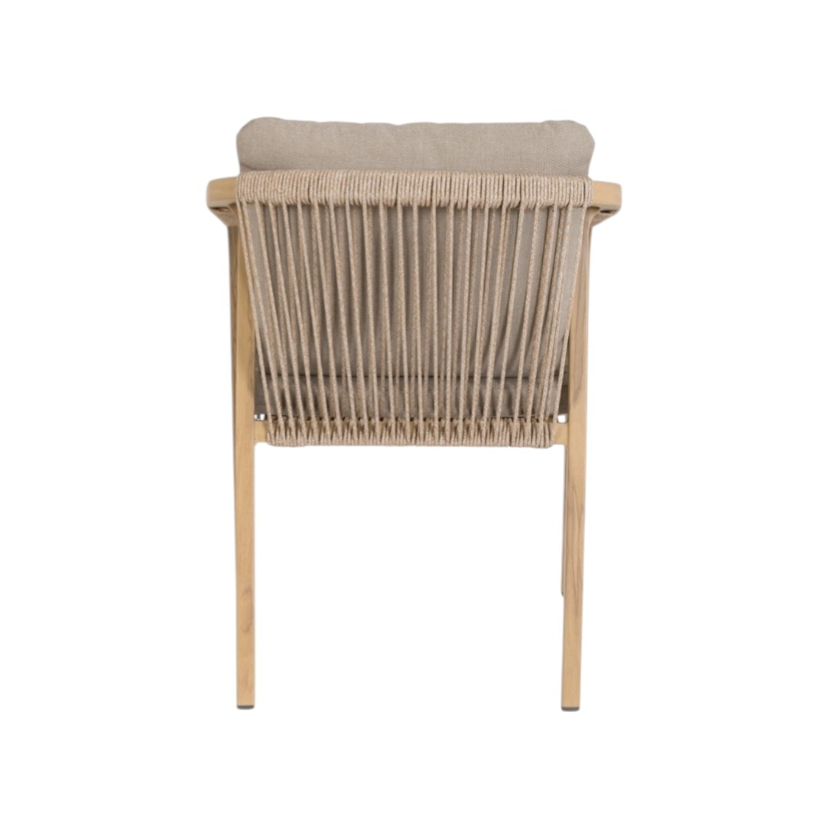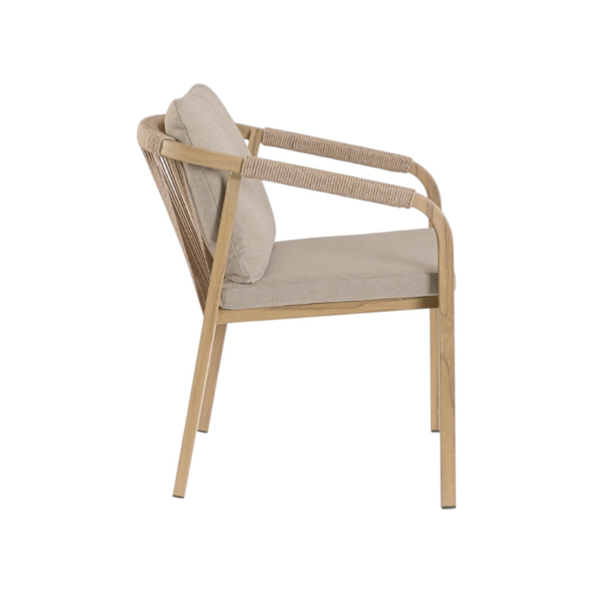 Silla de exterior apilable con estructura de aluminio efecto madera, cuerda trenzada y cojines desenfundables en tejido Olefin repelente al agua.