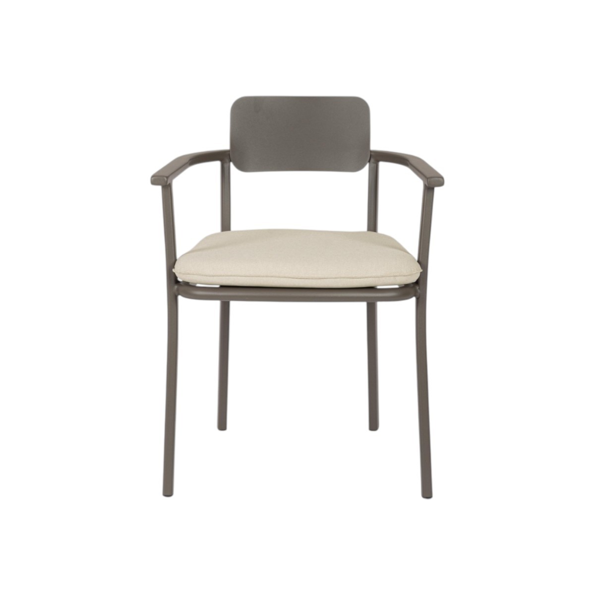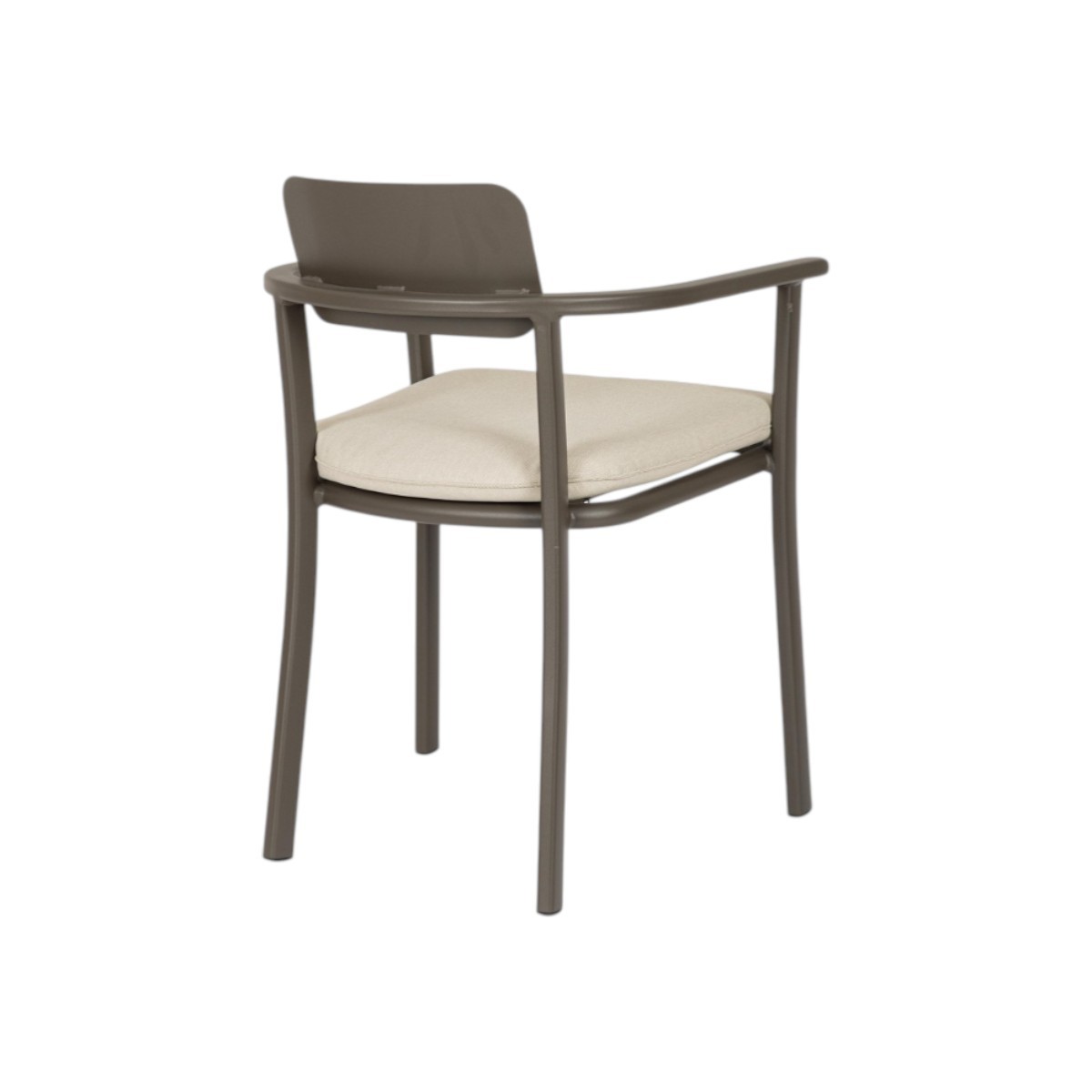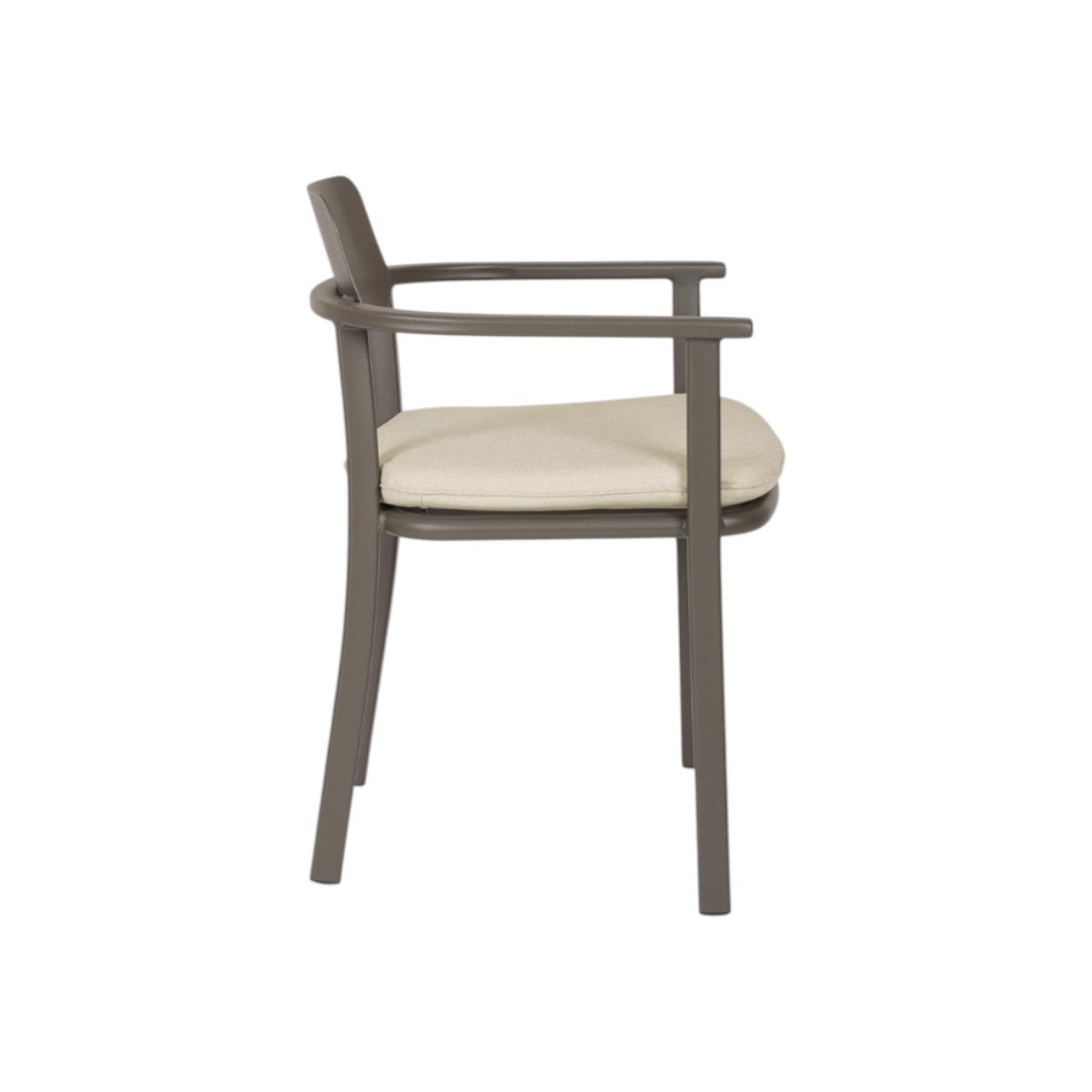 Silla de exterior ligera y resistente con estructura de aluminio y cojines técnicos repelentes al agua. Diseño cómodo, moderno y apilable.