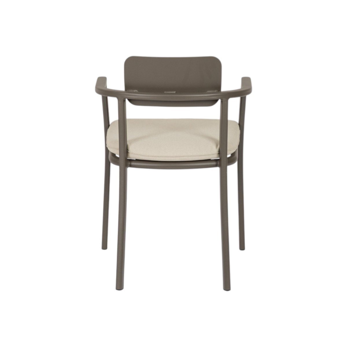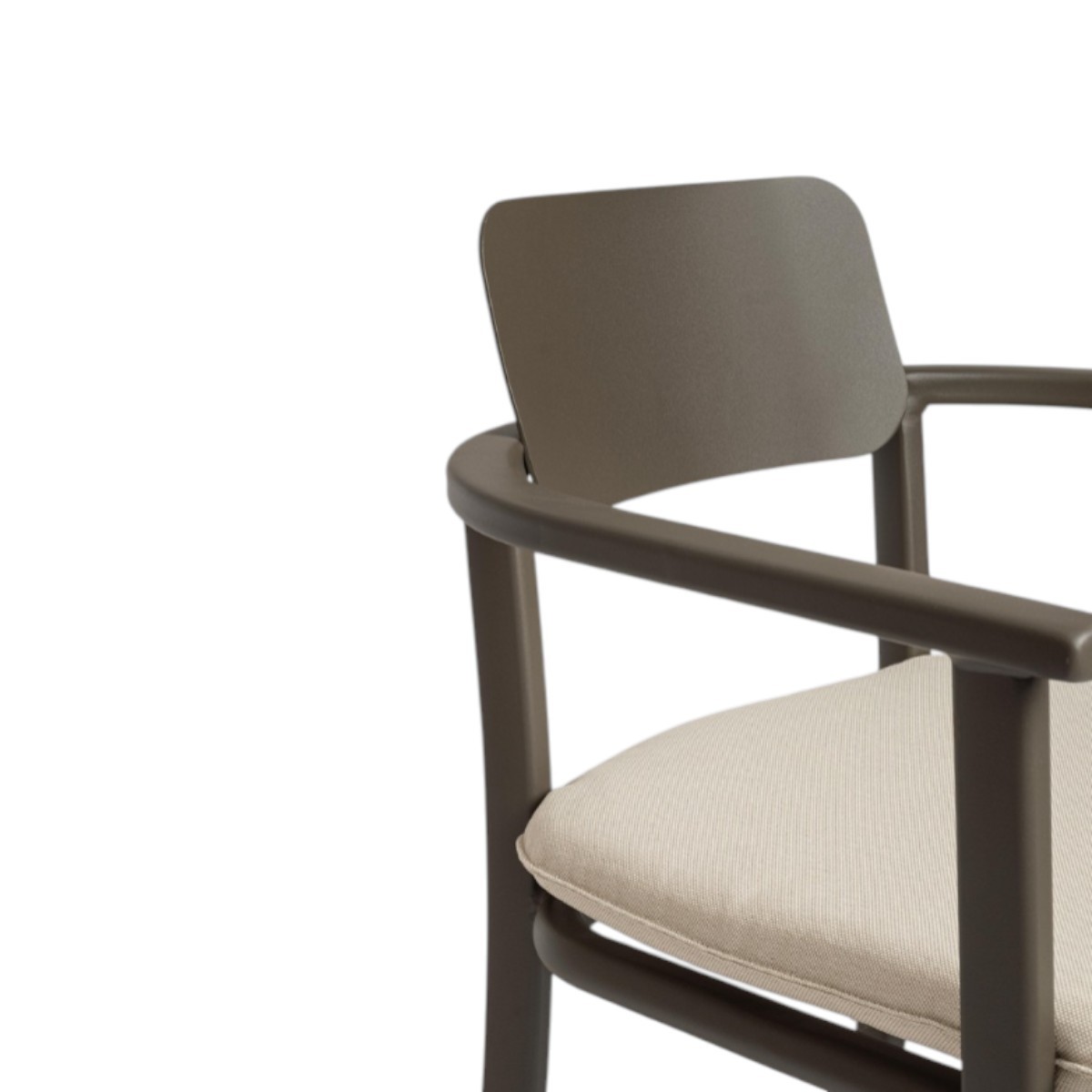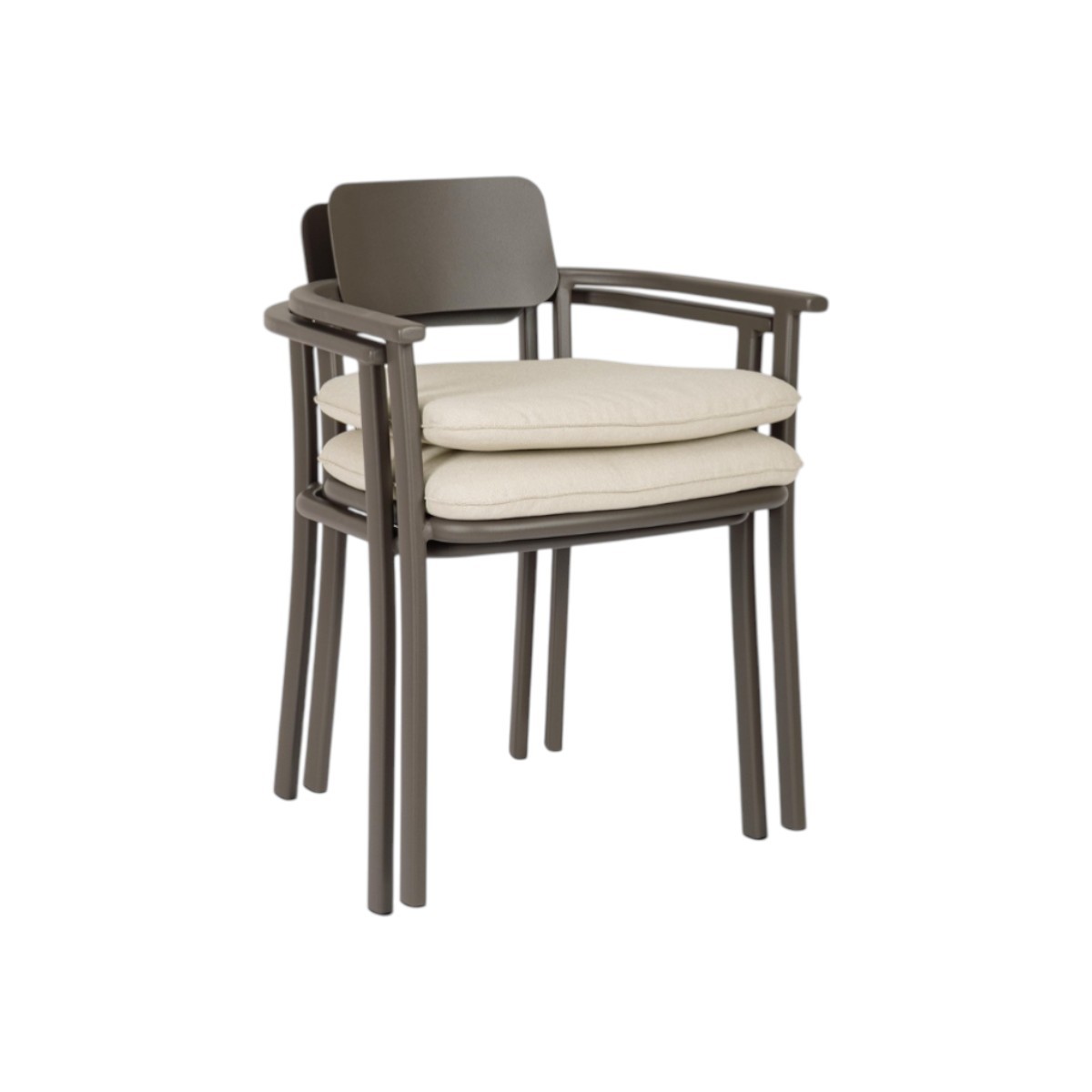 Silla de exterior ligera y resistente con estructura de aluminio y cojines técnicos repelentes al agua. Diseño cómodo, moderno y apilable.