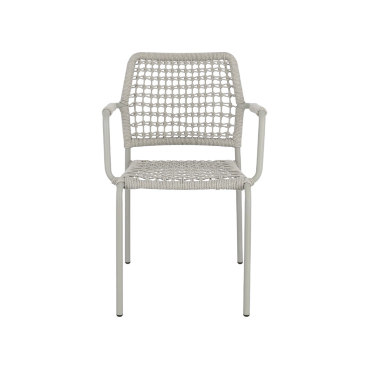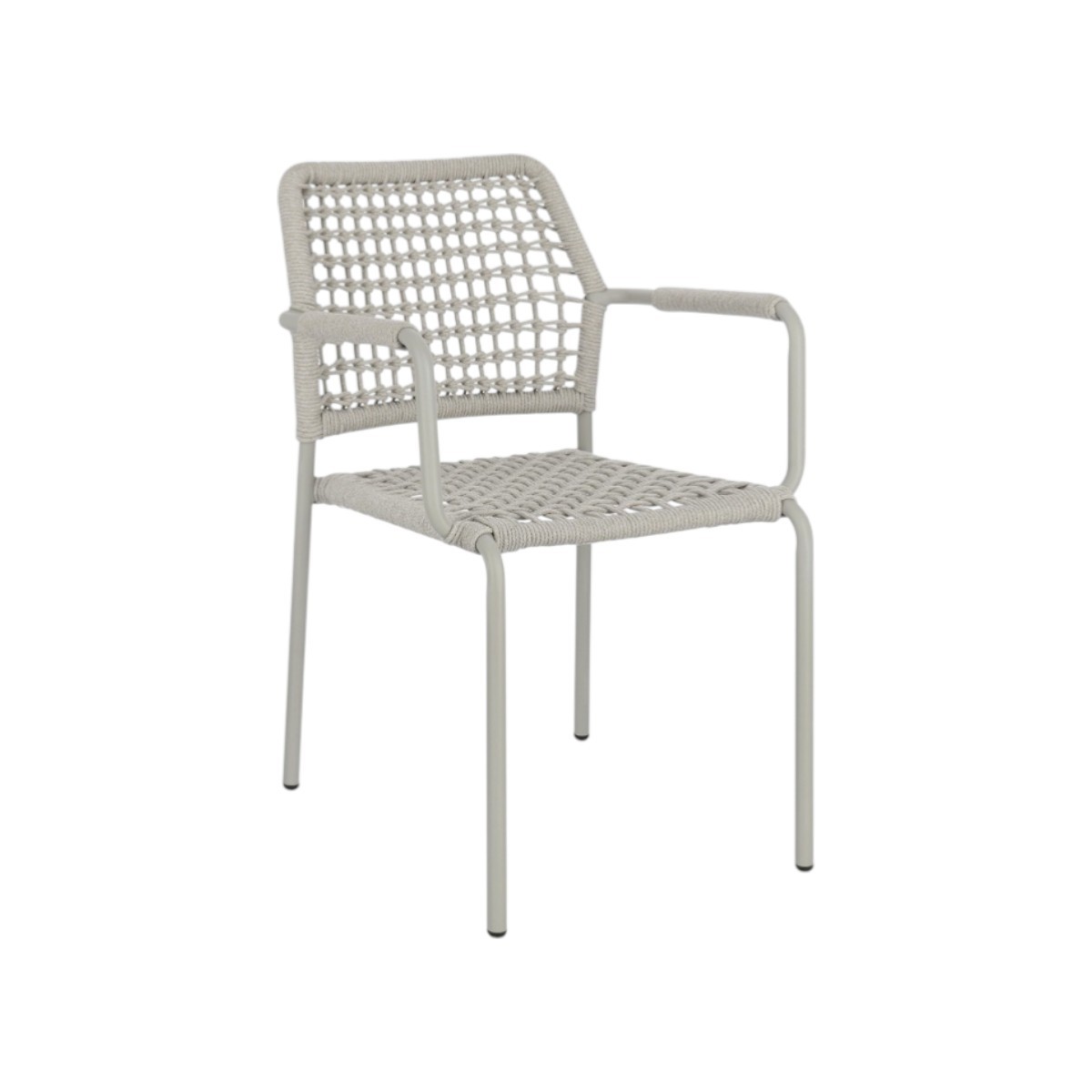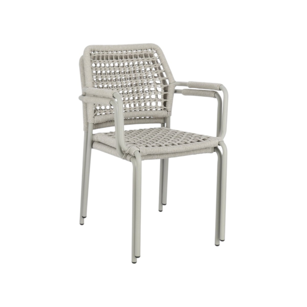 Silla exterior apilable con estructura de aluminio resistente y asiento trenzado en cuerda de poliéster. Perfecta para terrazas, jardines y espacios al aire libre.