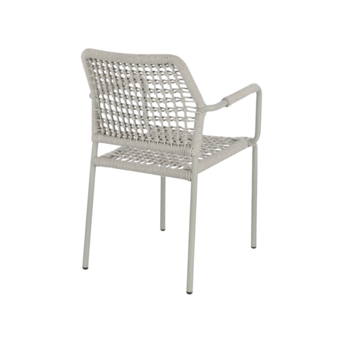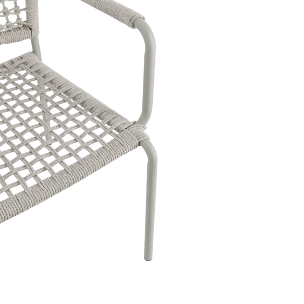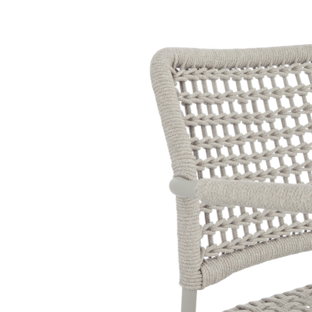 El asiento y respaldo, realizados en cuerda de poliéster entrelazada, proporcionan comodidad y ventilación, adaptándose perfectamente a ambientes exteriores como terrazas, jardines o patios.