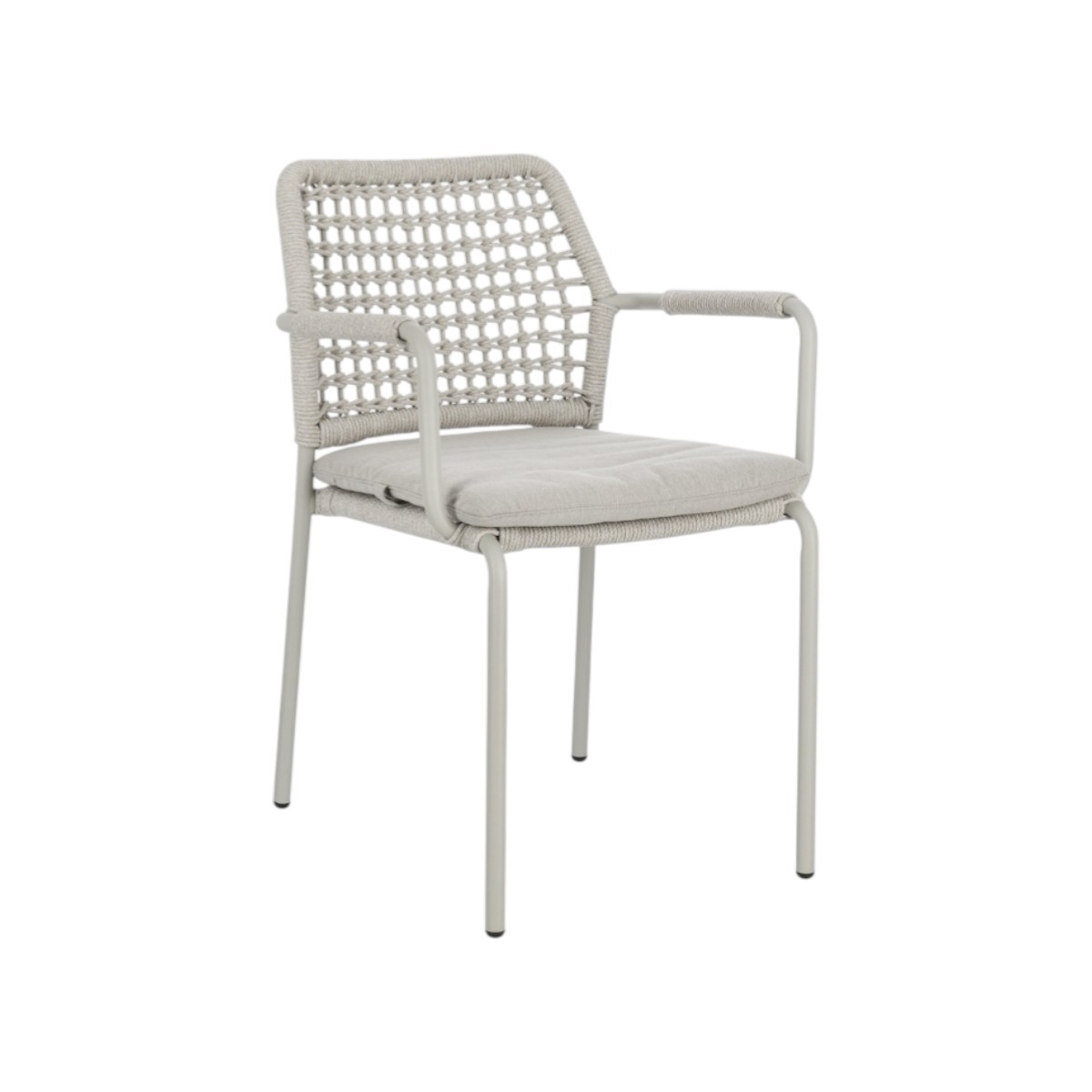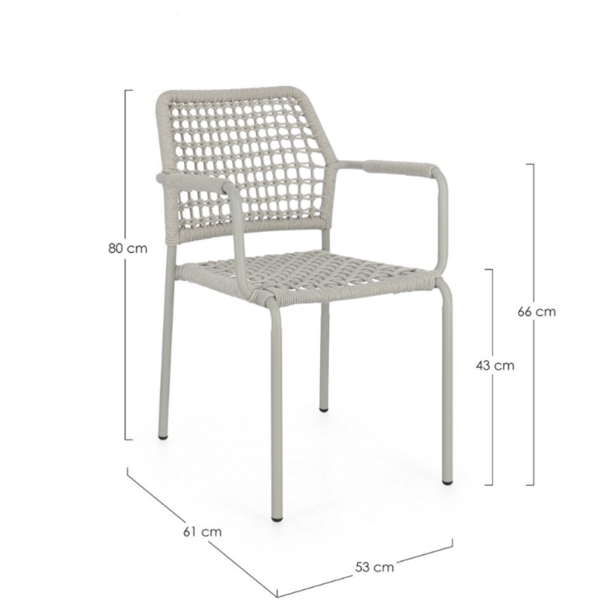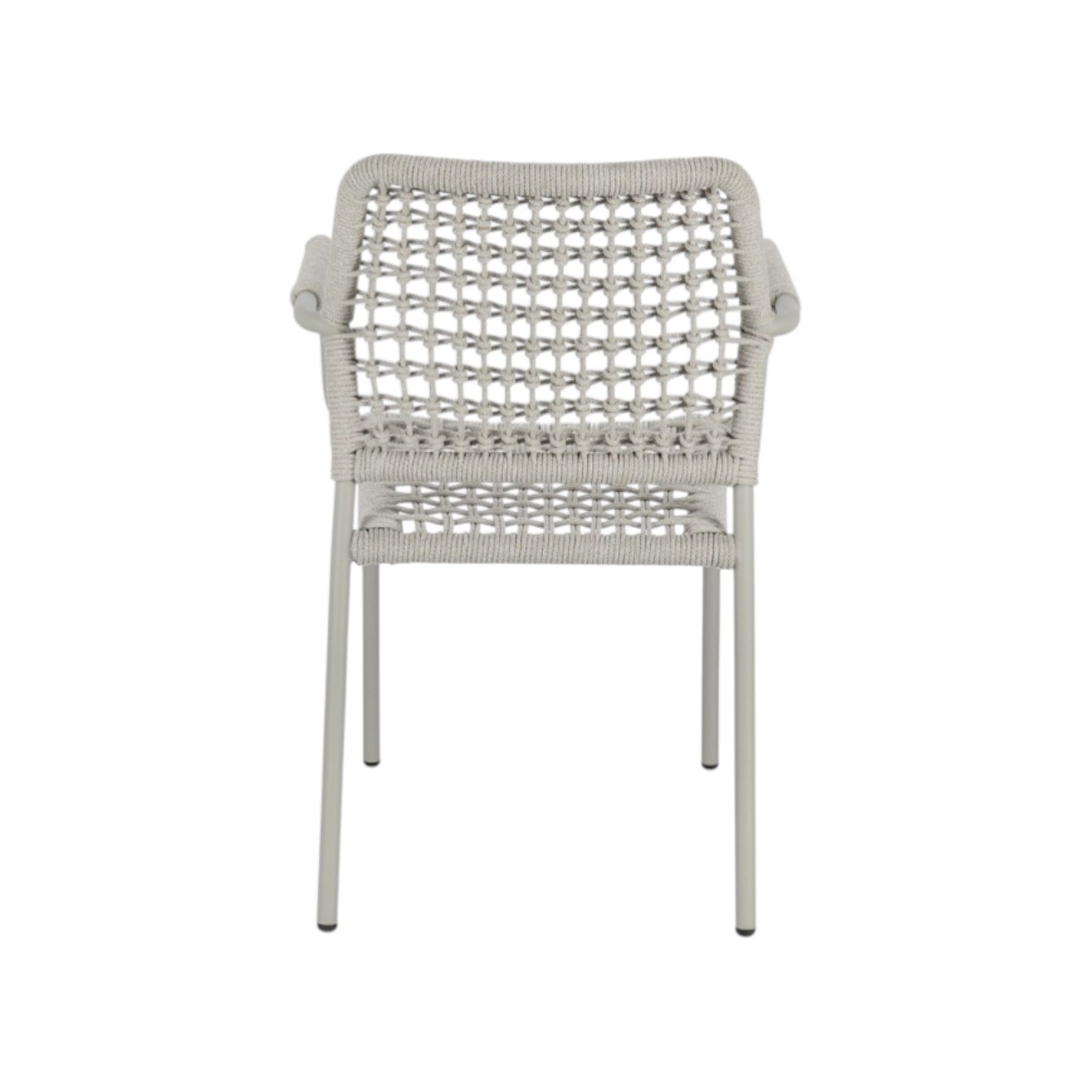 El asiento y respaldo, realizados en cuerda de poliéster entrelazada, proporcionan comodidad y ventilación, adaptándose perfectamente a ambientes exteriores como terrazas, jardines o patios.