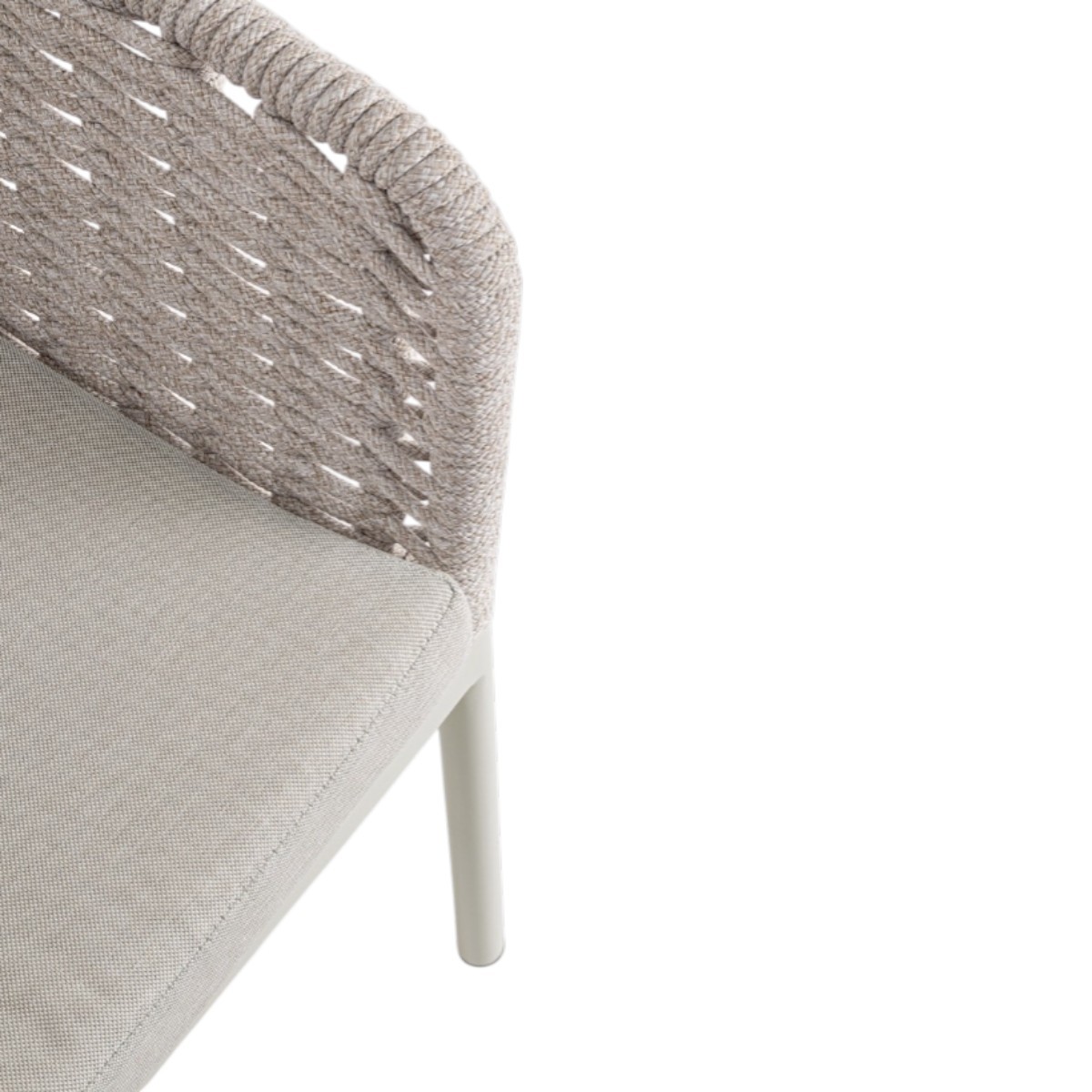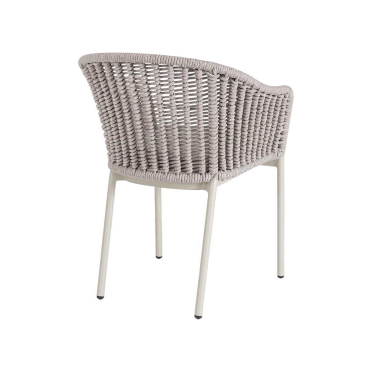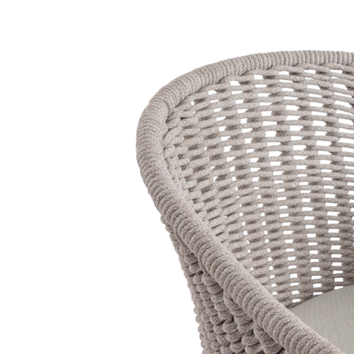 El asiento y respaldo presentan un trenzado de cuerda de poliéster diseñado específicamente para uso exterior, que combina estilo moderno con durabilidad.