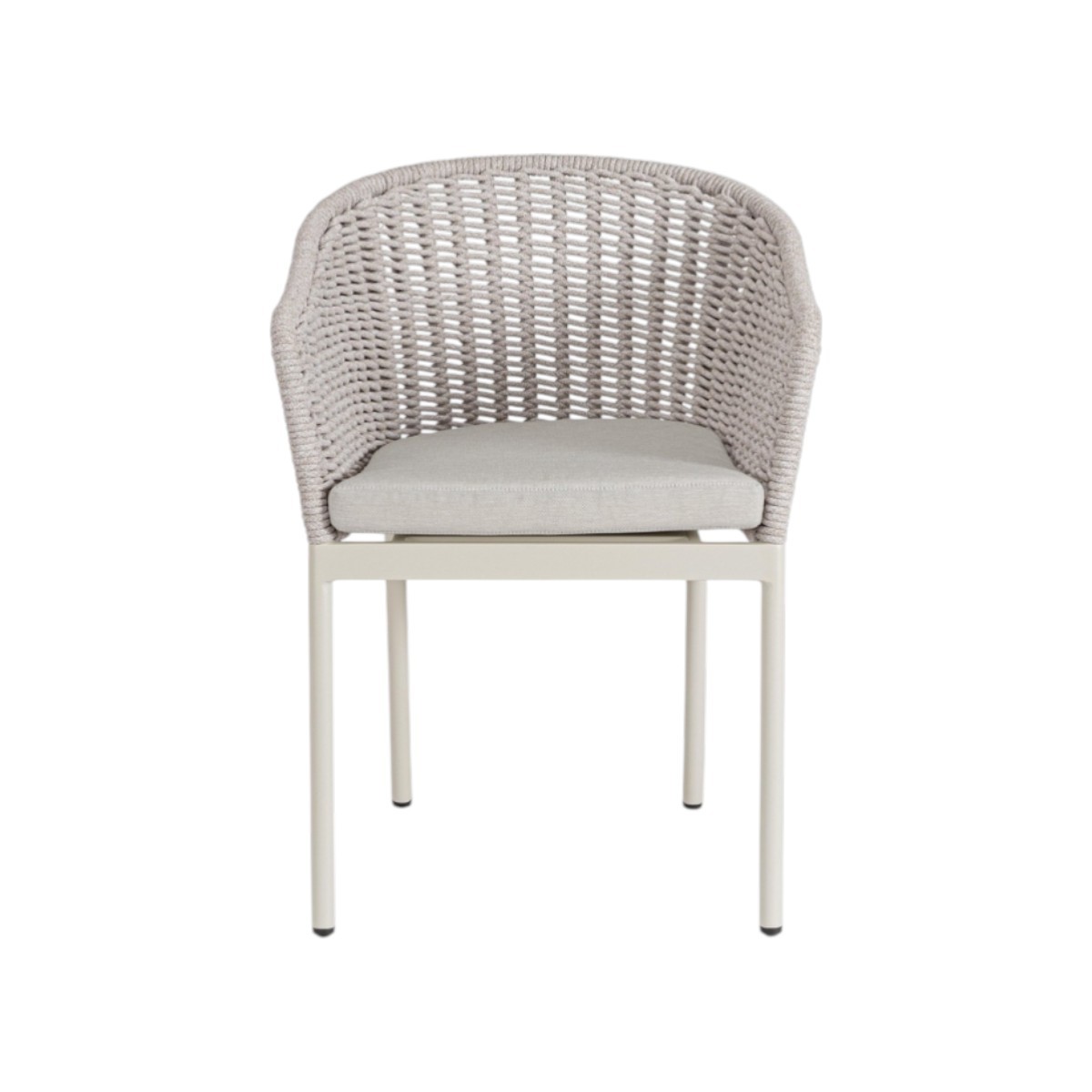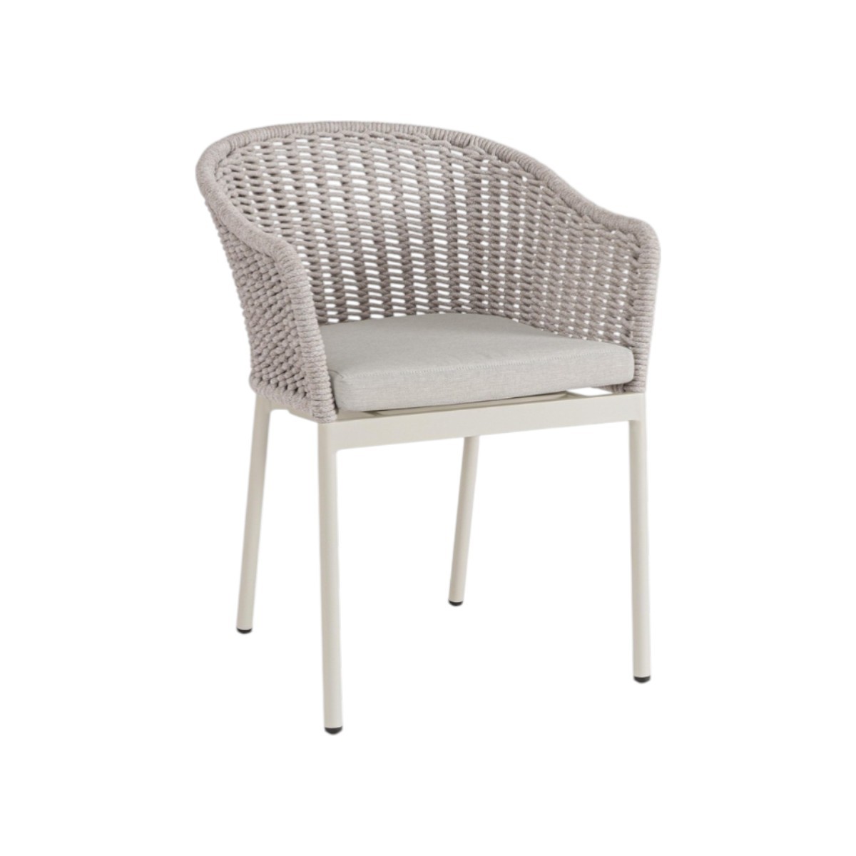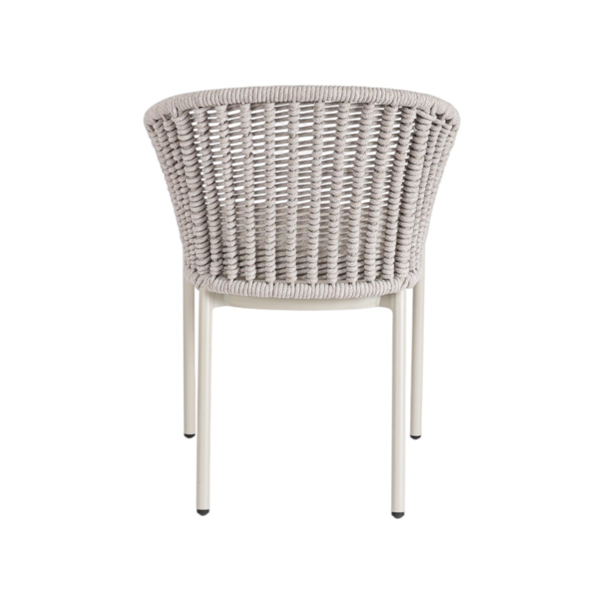 El asiento y respaldo presentan un trenzado de cuerda de poliéster diseñado específicamente para uso exterior, que combina estilo moderno con durabilidad.