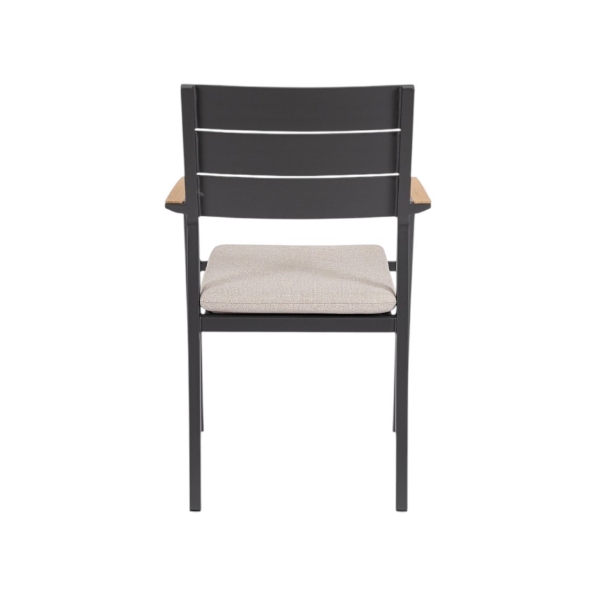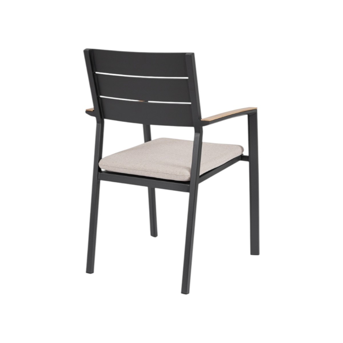Silla de exterior en aluminio con reposabrazos efecto madera y cojín desenfundable en tejido Olefin repelente al agua.
