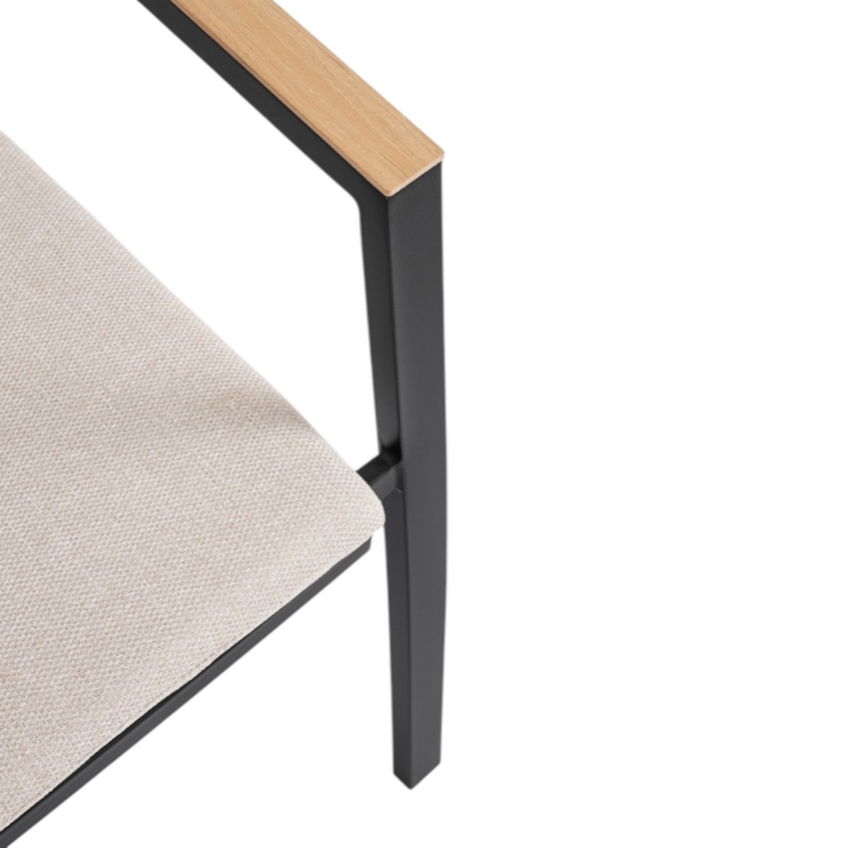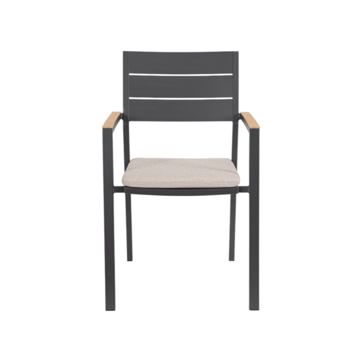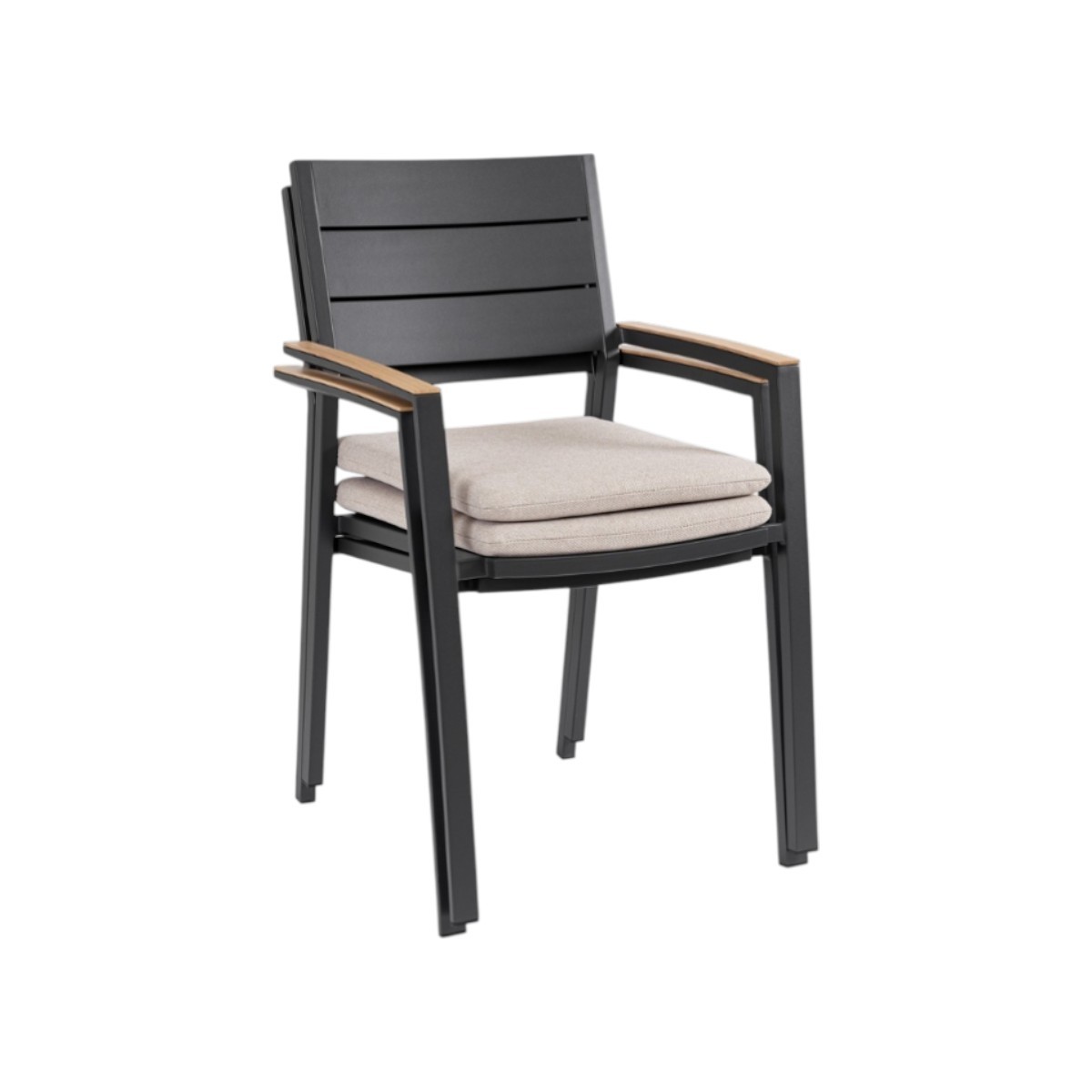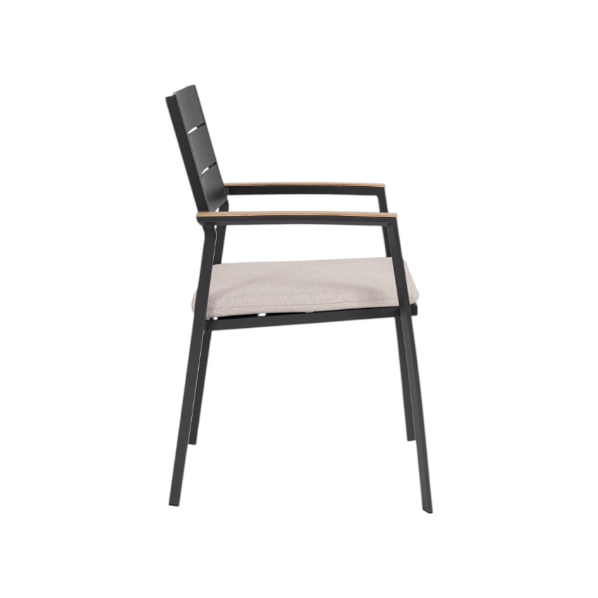 Incorpora reposabrazos en aluminio con un atractivo acabado efecto madera que aporta calidez visual y un diseño contemporáneo ideal para terrazas, jardines o zonas chill out.