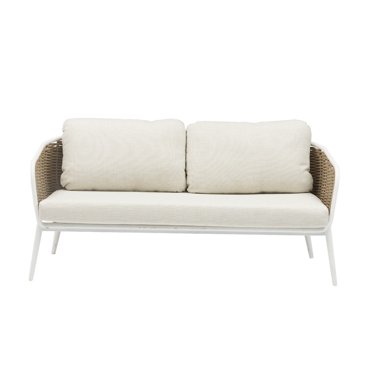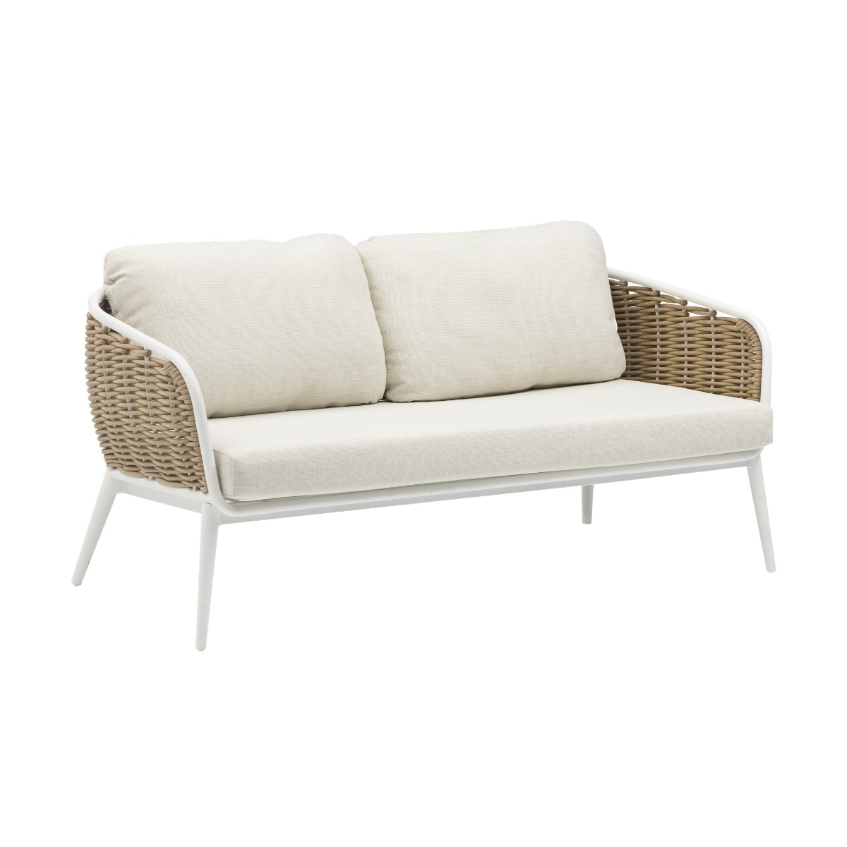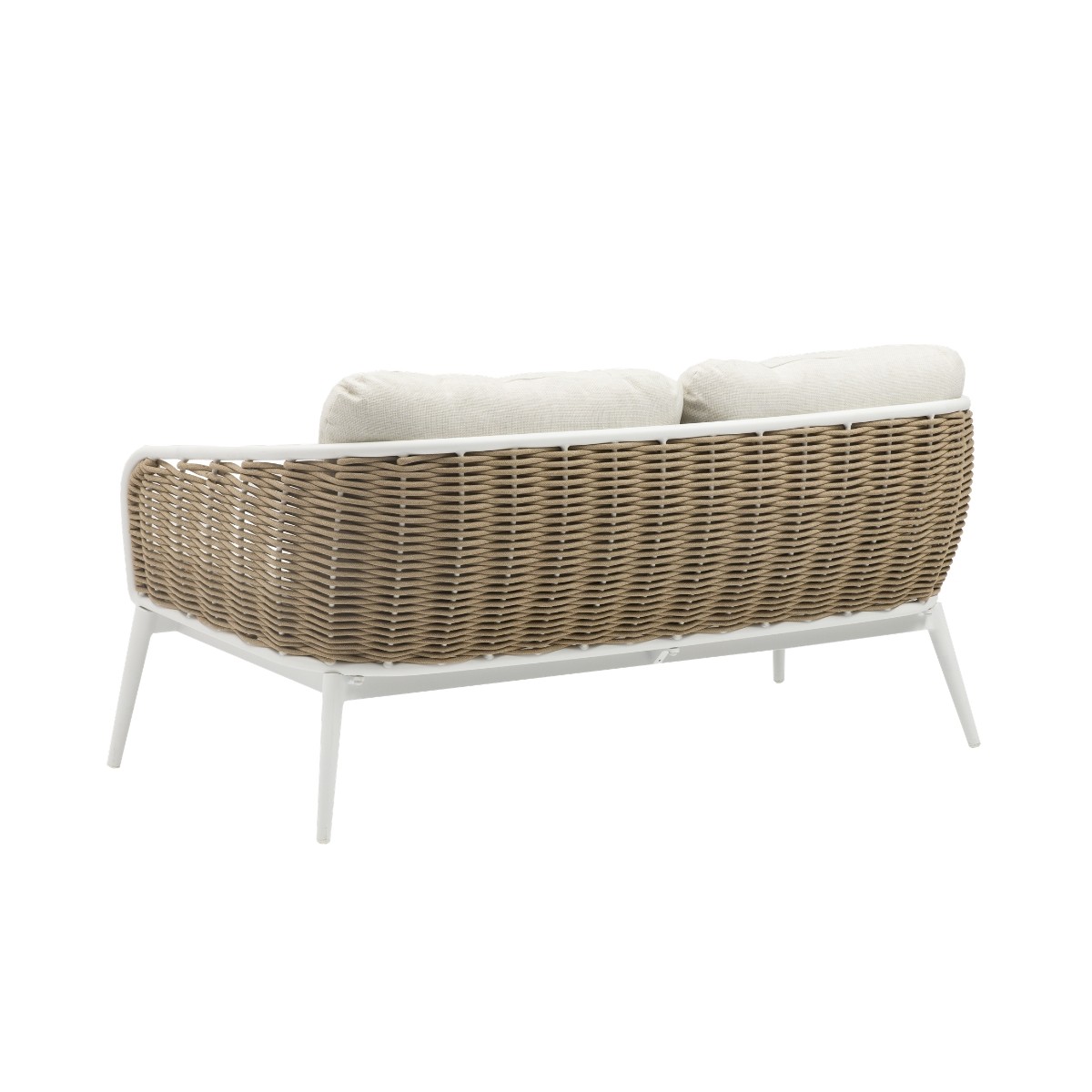Sofá 2 plazas para exterior con estructura de aluminio blanco y cuerda náutica taupe. Cojines gruesos de asiento y respaldo.