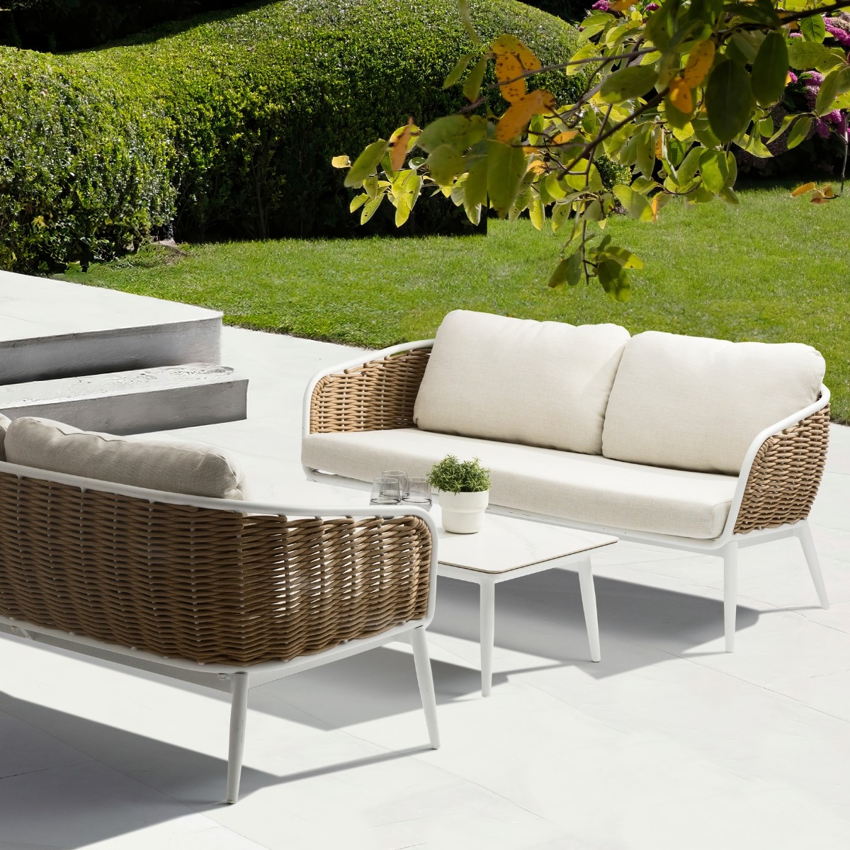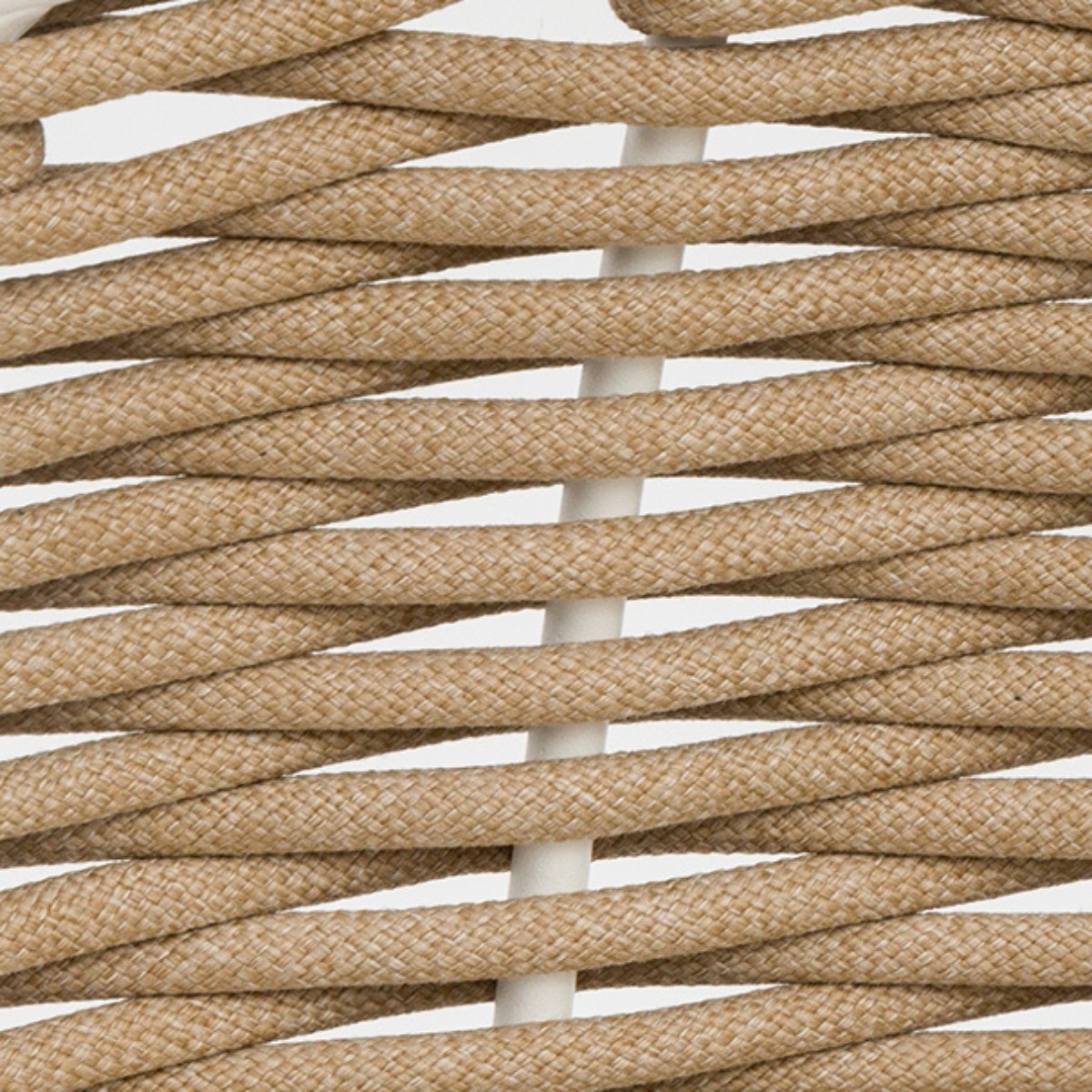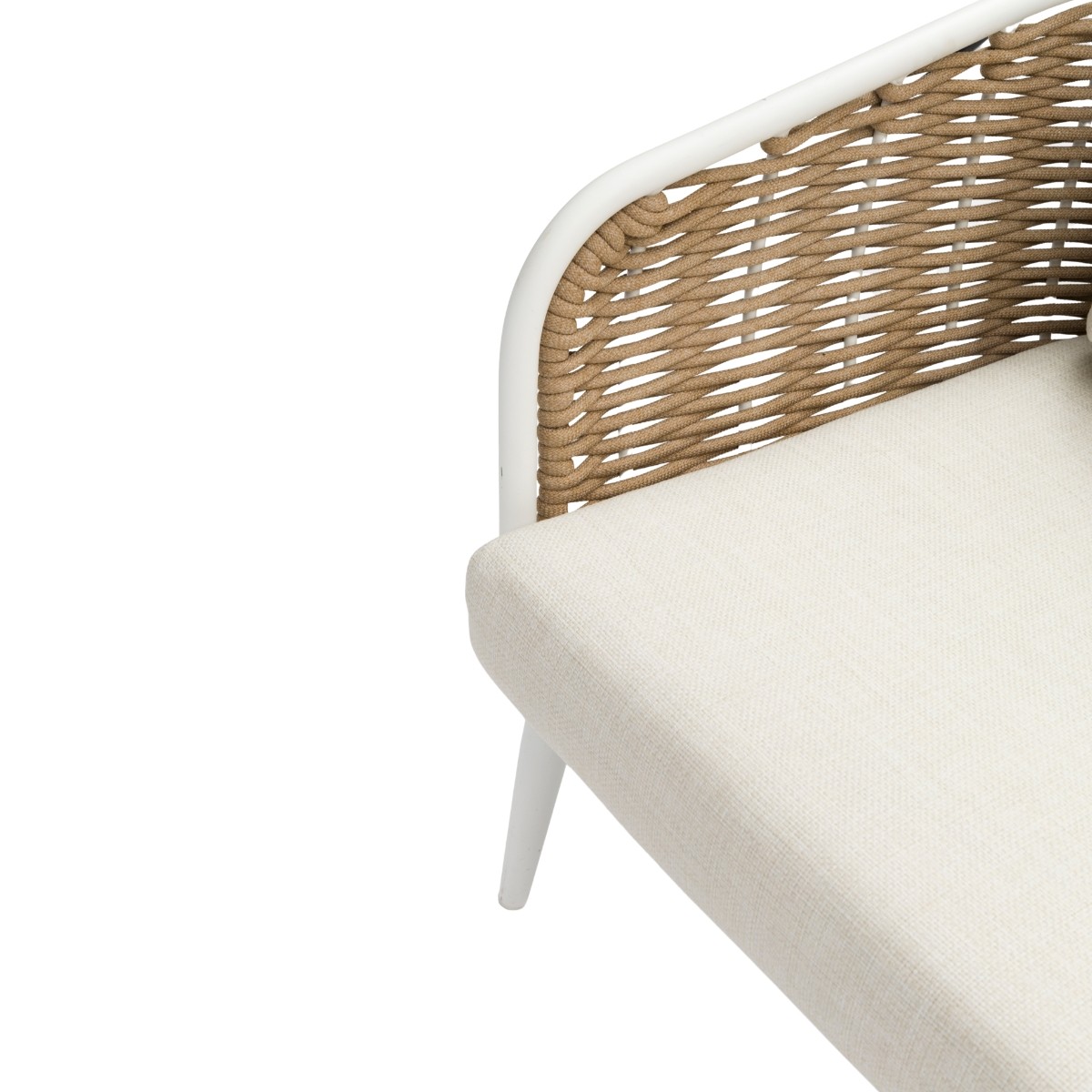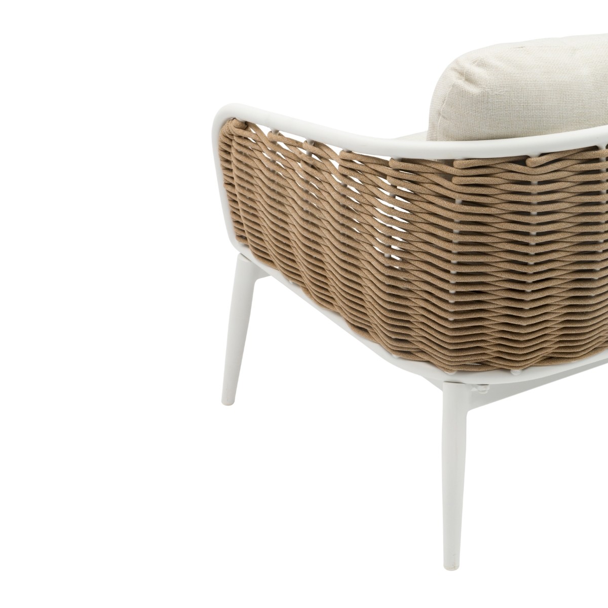 Su estructura de aluminio en acabado blanco se complementa con un elegante trenzado de cuerda náutica en tono taupe, aportando textura y durabilidad.