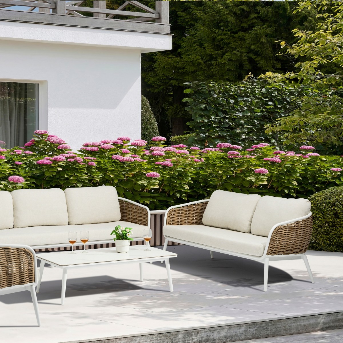 Los cojines de asiento de 12 cm y respaldo de 15 cm en color beige ofrecen una comodidad envolvente para el descanso al aire libre.