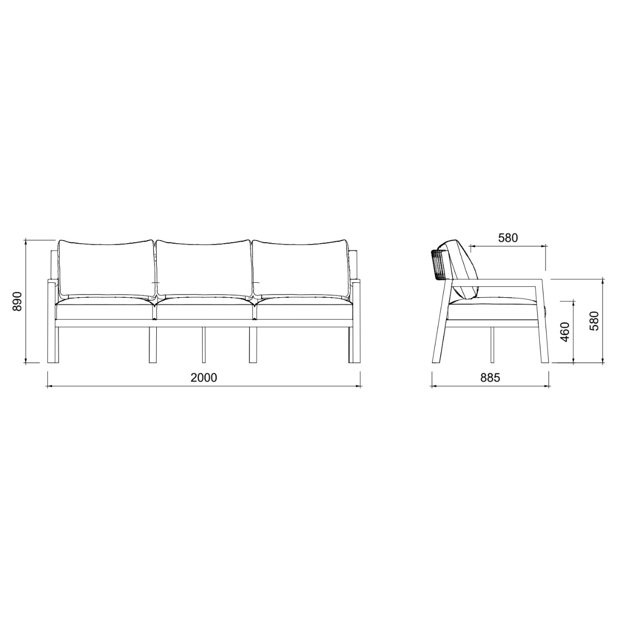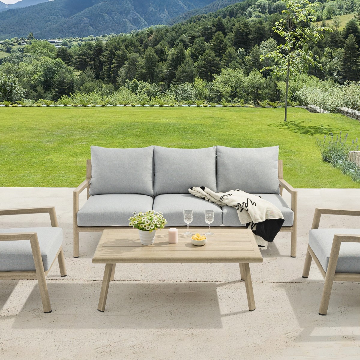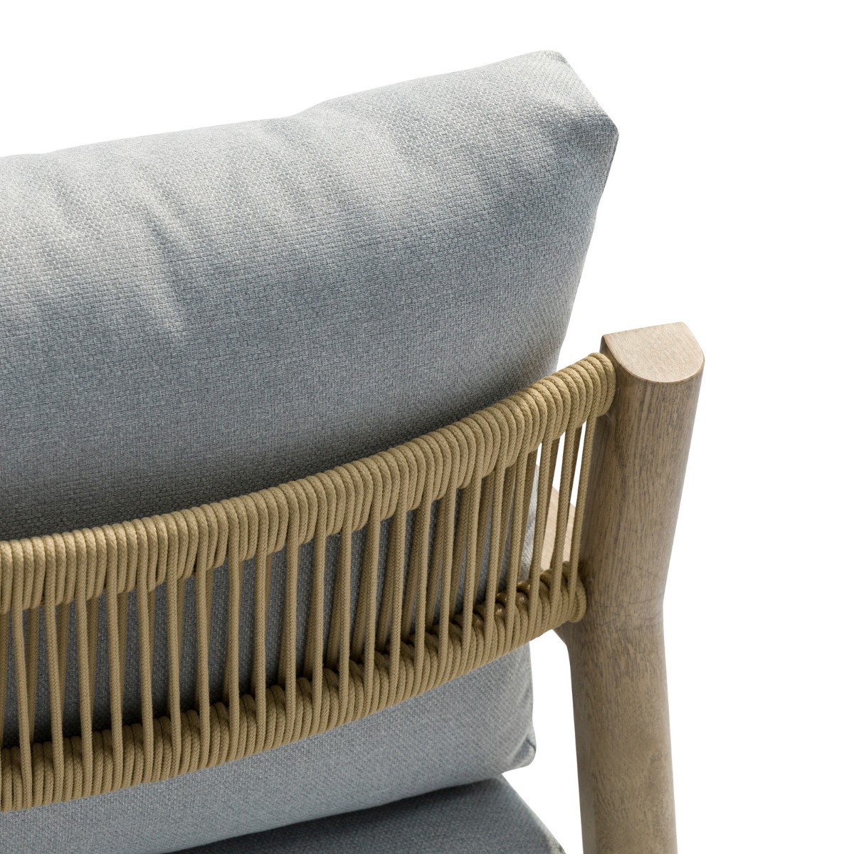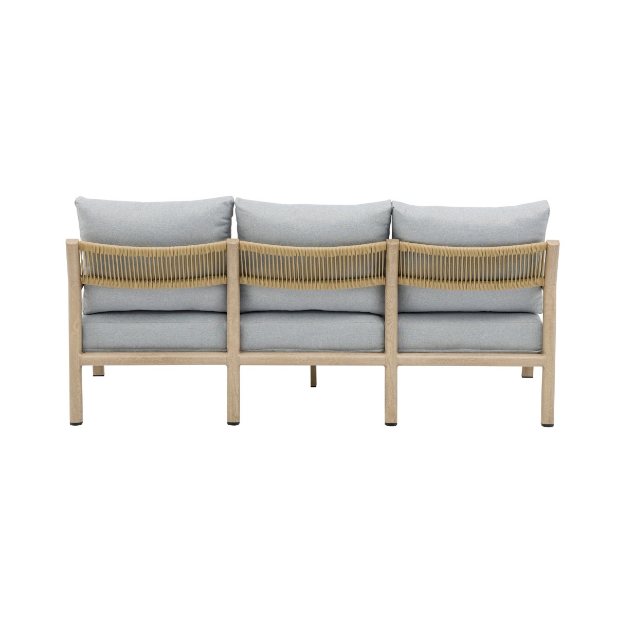 Sofá de 3 plazas para exterior con estructura resistente efecto madera y detalles en cuerda natural.