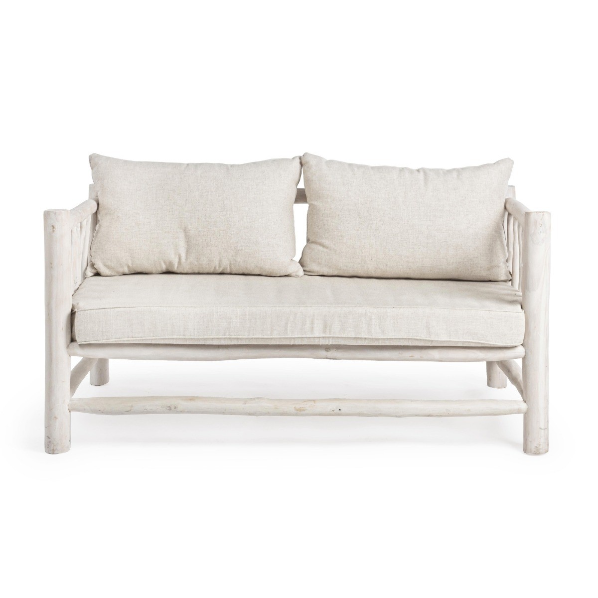 Sofá dos plazas Sahel con estructura de madera maciza blanca y cojines desenfundables.