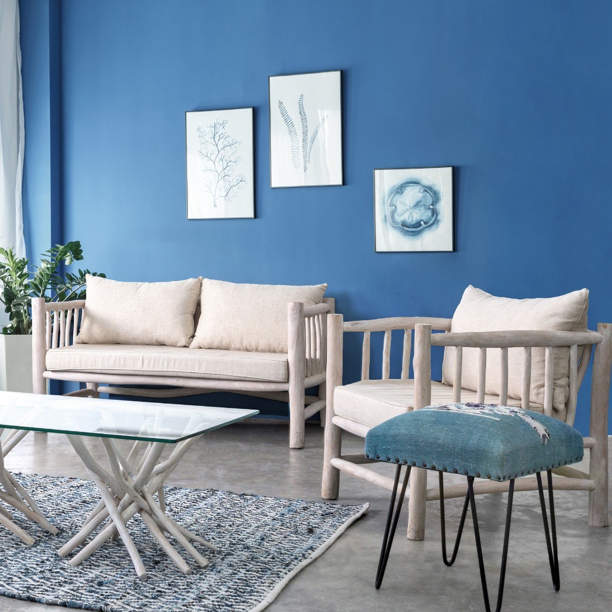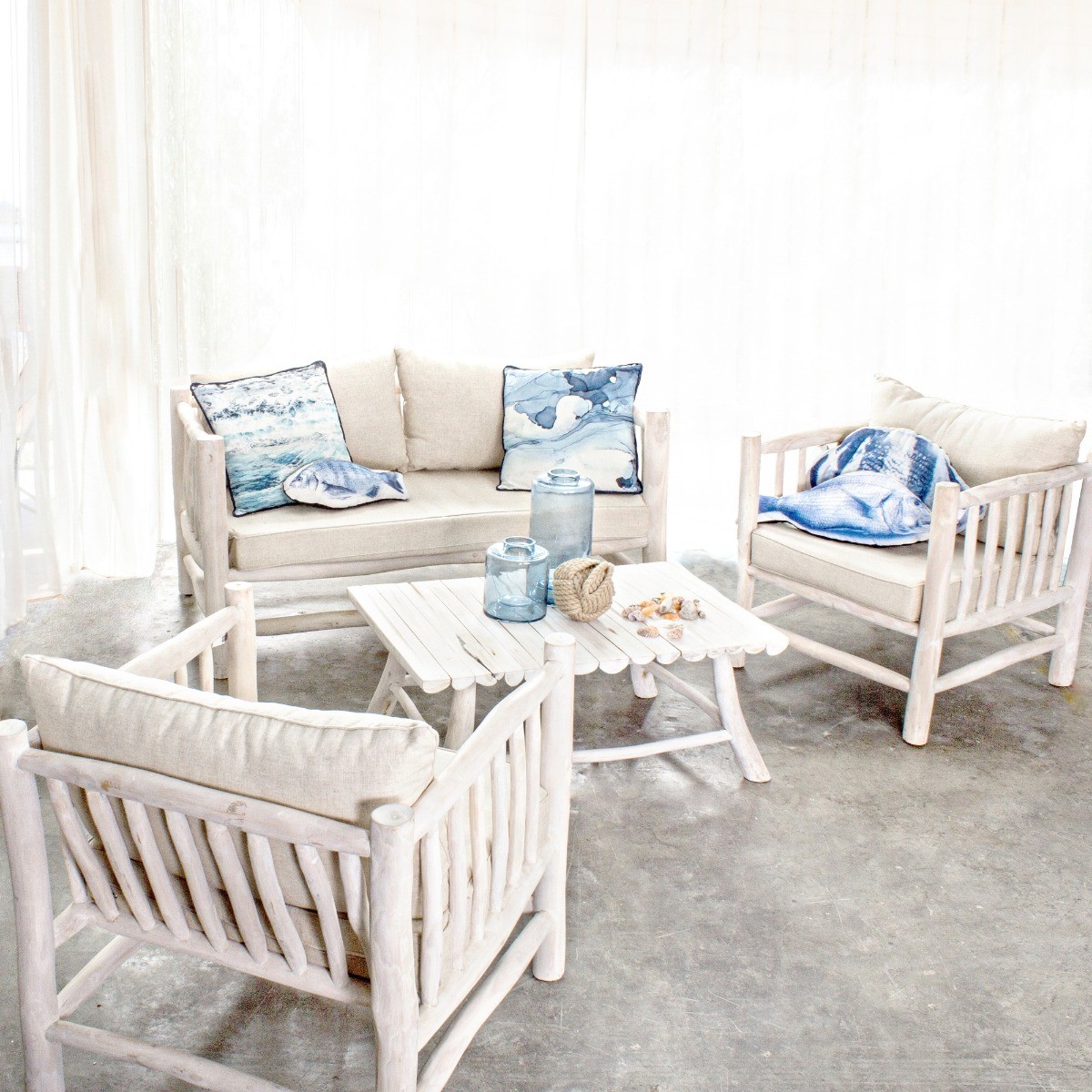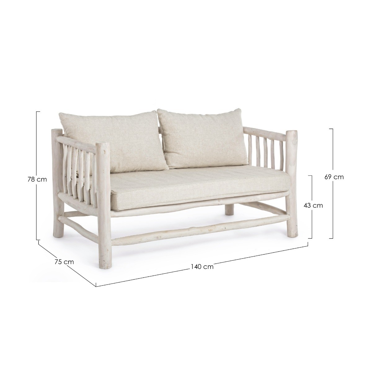 Está fabricado con una estructura de madera maciza a base de ramas de teca decapadas en color blanco. Tiene un asiento acolchado muy cómodo y el tejido de los cojines es desenfundable para su óptimo mantenimiento.